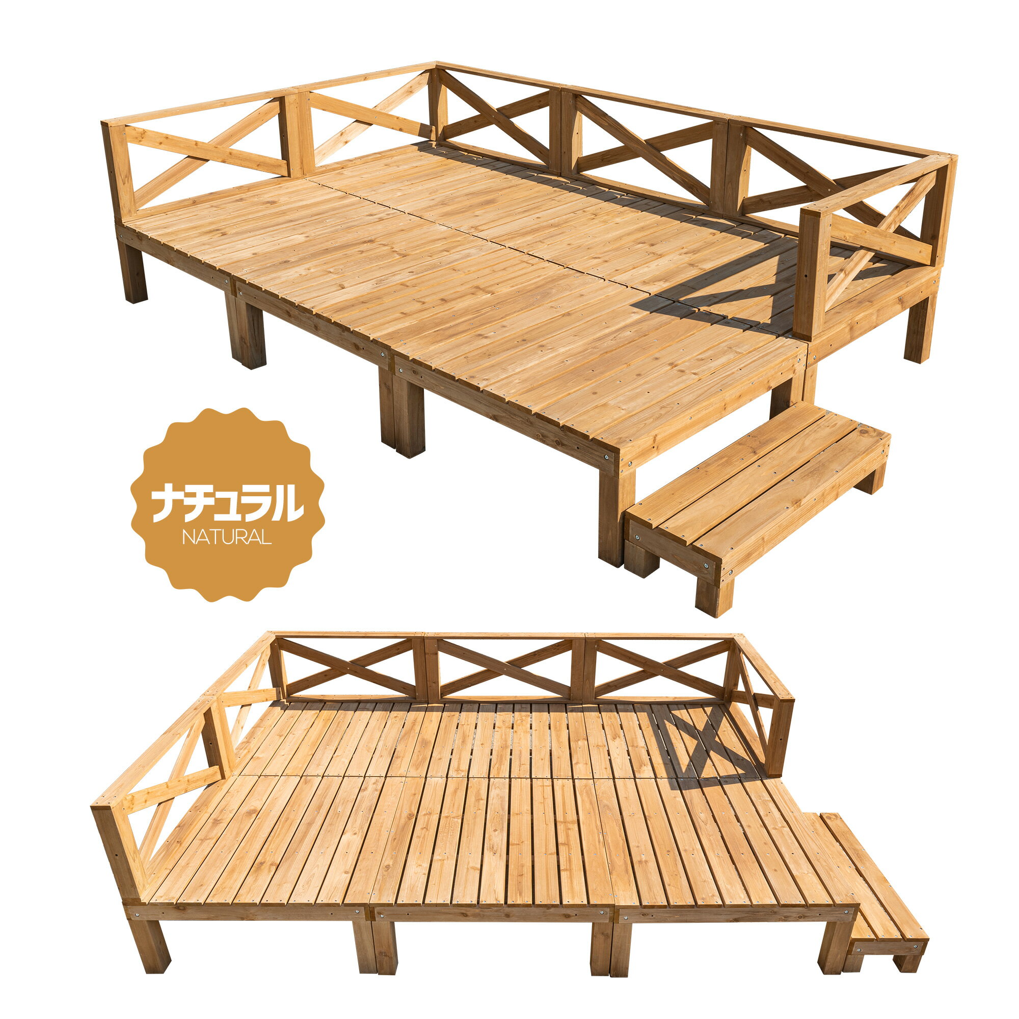 ウッドデッキ 天然木 キット 13点セット/8点セット/7点セット 自由な組み合わせ ウッドパネル 家具ガーデンファニチャーバルコニー ベランダ 踏み台付 北欧 キットウッド 新生活【ナチュラル】 ウッドデッキ 天然木 キット 自由な組み合わせ ウッドパネル 家具ガーデンファニチャーバルコニー ベランダ 北欧 キットウッド 踏み台付 ◎01【自然との調和を大切にした、心地よい木製デッキ】 日常に自然のぬくもりと優雅さを加える、シンプルでありながら洗練されたデザインで、庭に新たな命を吹き込みます。◎02目を見張る変化!庭が生まれ変わる瞬間 風に吹かれて、リラックスしたひととき 晴れた日には、木漏れ日が舞い込む心地よい空間。庭に設置されたウッドデッキで、ゆったりとした時間を楽しんでください。お気に入りの椅子に座りながら、風に乗って運ばれてくる木の香りを感じ、天然木の温かみを存分に味わえます。◎03大きなサイズでみんなが快適に使える 90×90CMサイズのウッドが6台、手すりが2枚、コーナー手すりが2枚、ロータイプ踏み台が1台のセット。超ゆったりサイズで家族と一緒に楽しい時間を過ごしましょう。◎04デスクに置けるので、あなたらしい使い方が自由に作れます。バーベキューやガーデンパーティーにも最適なスペースを提供します。リビングの延長として、さまざまなアウトドアアクティビティを楽しむことができます。お子さんやワンちゃんが自由自在に転がることもできる。昇り降りをもっと楽に スッテプありつつご高齢の方やお子様でも簡単に昇り降りすることができます。◎05自然の力を感じる天然木 天然の杉材を使用することで、木の質感を肌で感じることができます。経年変化を楽しめる杉は、時間と共に美しい木目や色合いの変化を見せ、四季折々の風景をより一層引き立てます。抗菌や防虫作用の効果もあるので、長い期間ご愛用できる木材となります。◎06夏は涼しく、冬は暖かな足元 天然木のウッドデッキは、夏は涼しく、冬は温かく、季節を問わず快適な環境を提供します。表面の温度変化が少ないため、年中使いやすいのが特徴です。◎07雨の日でも安心!優れた水はけ パネルに隙間があるため、雨が降っても水がスムーズに流れ、濡れることなく使用できます。雨の日でも気にせず快適にお使いいただけます。◎08安心して使える仕上げ 美観維持と腐食防止対策として水性ステインで木材を塗装。木目を活かしたウッドの風合いが美しい仕上がりです。""天板の抜けを防ぐために栈を2本作ります。これにより、安定性と安全性が向上し、デッキの強度も高めることができます。◎09アレンジ可能!自由な組み合わせ フェンスはデッキの四隅に設置できるから、お好みの向きで設置可能。踏み台も置き型タイプなので、お好みの位置をお選びいただけます。場所にあわせてスタイル自由自在。 デッキ本体X6手すりX2コーナー手すりX2ステップX1◎10●本製品はお客様組立式です。●天然の木材ですので、乾燥により5%ほど収縮する場合がこざいます。●まれに配送中に外箱に汚れが付いてしまうケースがこざいます。●また、下記のような症状も見られますので、何卒こ容赦くださいませ。 5