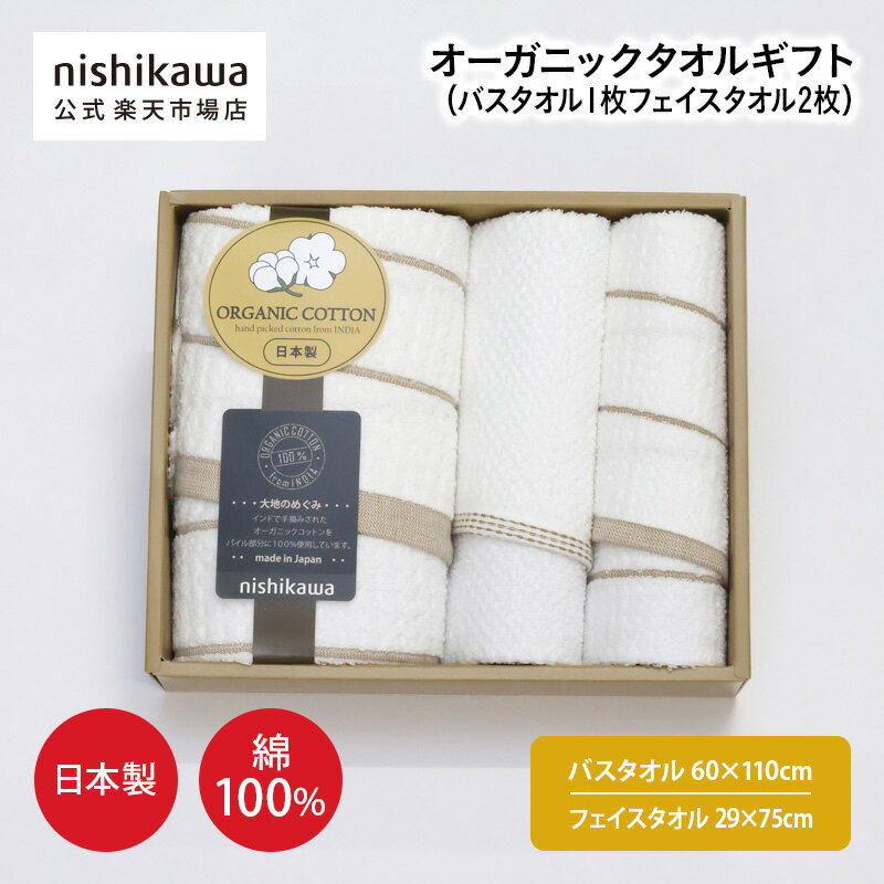 nishikawa(西川)公式【アウトレット】オーガニックタオルギフト(バスタオル1枚フェイスタオル2枚) ※在庫限りにつき特別価格バスタオル(60×110cm) フェイスタオル(29×75cm)日本製/綿100%/バスタオル1枚フェイスタオル2枚/パイル部分オーガニックコットン100%