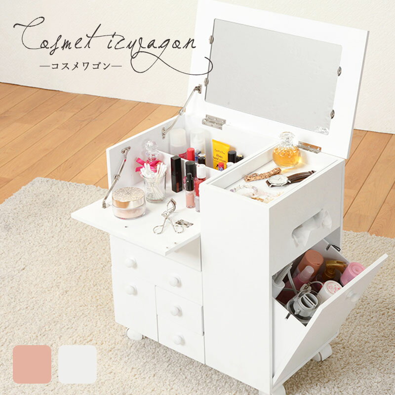 【11/15(土)20時〜★ポイント5倍】コスメワゴン キャスター付き 完成品(化粧品 収納 スリム おしゃれ 大容量 かわいい ドレッサー ロータイプ 白 ホワイト コンパクト コスメ収納 ワゴン 木製 ミラー付き 鏡付き ミニドレッサー メイクアップワゴン 白家具 姫系)