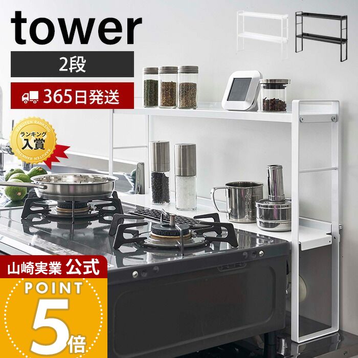 【365日出荷】山崎実業 コンロ横ラック2段 タワー tower 公式 スパイスラック 調味料ラック 鍋置き キッチンラック 2段 コンロ横 コンロ奥 キッチンツール 収納 キッチン収納 ホワイト ブラック 5150 5151