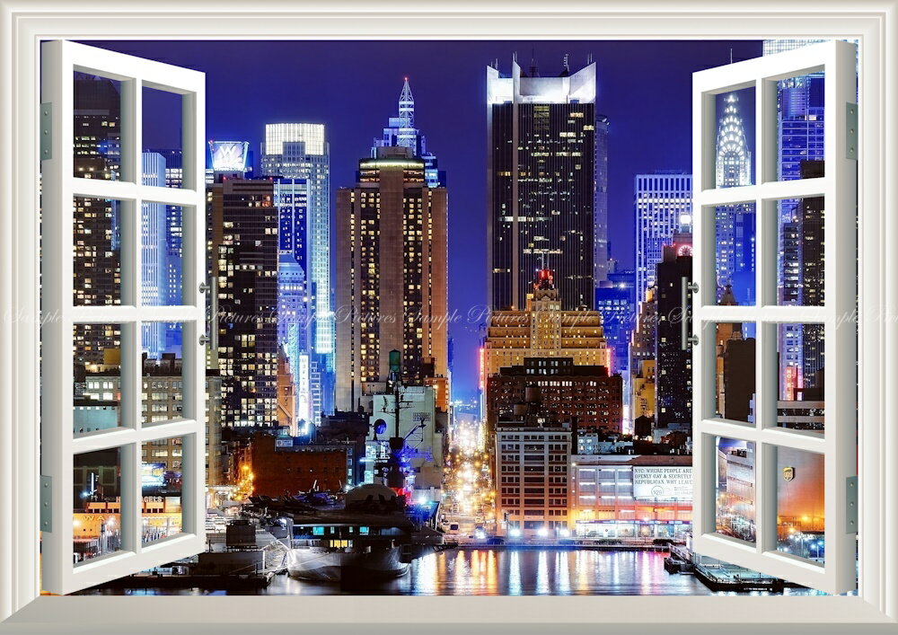絵画風 壁紙ポスター (はがせるシール式) -窓の景色- タイムズスクエアの夜景 ニューヨークの夜景【窓仕様/トリックアート】 キャラクロ NYK-023MA1 (A1版 830mm×585mm) <日本製> ウォールステッカー お風呂ポスター