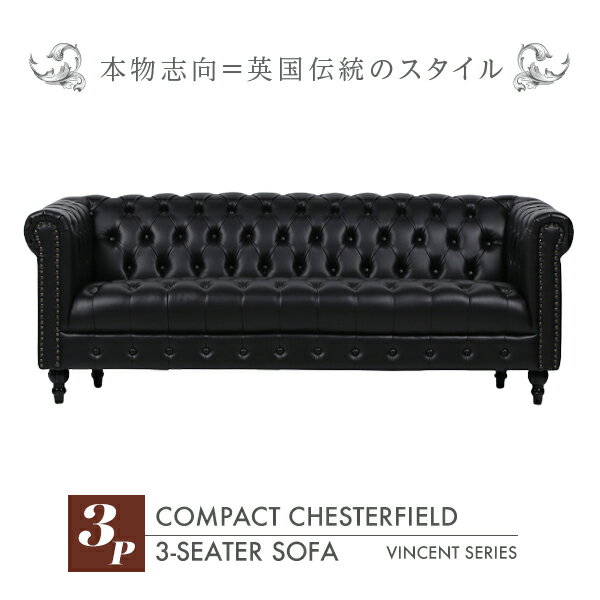 輸入家具 チェスターフィールド ソファ 3人掛け 三人掛け アンティーク コンパクト チェスターフィールド ソファー ヴィンテージ レザー 本革調 チェスターフィールドソファ ブラック 黒色 ダークカラー チェスターフィールド ソファ チェスター ボタン VCB3P32K