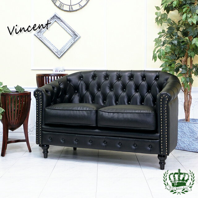 輸入家具 二人掛けソファ ヴィンセント ソファー アンティーク チェスターフィールド ソファー 2人掛け ダブルソファ イギリス 英国 エレガント 書斎 美容室 本物の高級感 ヴィンテージ レトロ おしゃれ デザイナーズ PU 合皮 フェイクレザー ブラック 黒 スリム VL2P32K