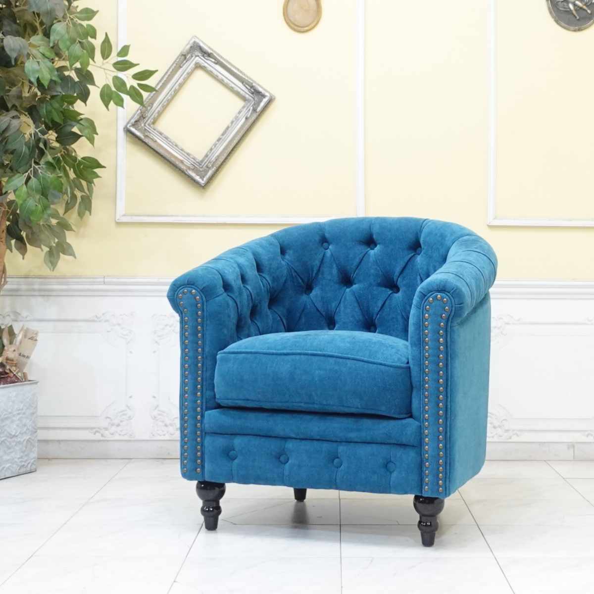 ブルー シャーベットブルー 水色 くすみ くすみカラー くすみ系 スモーキー スモーキーカラー 西洋 ヨーロッパ フランス フレンチ 仏 イタリア イタリアン 伊 英国 イギリス ブリティッシュ アンティーク アンティーク調 クラシック クラシカル レトロ インテリア 店舗什器 店舗家具 輸入家具 ディスプレイ什器 エレガント シンプル 布地 布製 布 ファブリック ベロア ベルベット 肘掛け 小振り 応接セット サロン ホテル ロビー カフェ レストラン ラウンジ【VINCENT】 英国調チェスターフィールドソファ 当店のこだわりとお薦めポイント ※画像をクリックすると拡大します FRONT BACK 丸みのあるコンパクトなフォルム 丁寧に一点ずつ打ち込まれた単鋲仕上げ 当店独自デザインの木製ろくろ脚 優しい肌触りの布地 品名 【VINCENT】1人掛けソファ / シャーベットブルー 布地 品番(商品コード) VL1F238K サイズ W 73cm x D 67cm x H 75cm / シート高:45cm シートサイズ:W 45cm x D 50cm ※若干の誤差はお許しください。 カラー 張地:シャーベットブルー 脚:ブラック 材質 本体:天然木材、シリコンフィル、ウレタンフォーム、ウェービングテープ、Sバネなど 張地:布地 配送方法・送料 アートセッティングデリバリー【家財便】 開梱・設置・資材回収サービス付き ■料金については欄外の送料表をご参照ください。 ※送料は、自動計算に反映されません。ご注文確認後、送料を含む総額をお知らせいたします。 納期目安について 通常の場合発送日から約3〜8日後の到着予定。(お届け地域により異なります。) 受注生産の場合 カート付近にある出荷(納期)予定をご確認ください。 尚、輸入家具となりますので、遅れが生じる場合もございます。予めご了承くださいませ。 商品説明 本格派の英国調ソファ 『VINCENT ヴィンセントシリーズ』 少し丸みを持たせたコンパクトなフォルム。 伝統的なチェスターフィールドデザインを採用し、 レトロでありながらも洗練された印象を与えます。 連鋲は使用せず、1点1点丁寧に単鋲で仕上げたところもこだわりのひとつ。 座面クッションは、 シリコンフィル+高密度のウレタンフォームの2層構造で座り心地にもこだわりました。 コンパクトで空間に取り入れやすく幅広いシーンで活躍してくれます! 書斎や応接室などのご自宅用にはもちろんのこと、店舗様にもおすすめです。 備考 この商品は当店実店舗・公式サイト・他モール等でも販売しております。 在庫数の更新は随時行っておりますが、 お買い上げいただいた商品が品切れになってしまうこともございます。予めご了承くださいませ。