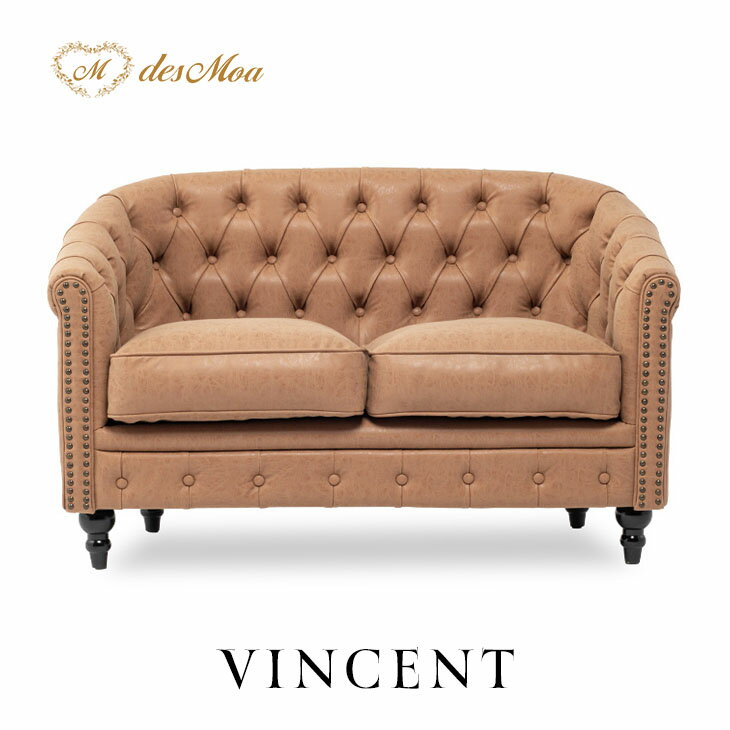 VINCENT ヴィンセントシリーズ ラウンジソファ 2人掛けソファ 2シート 2人用 コンパクト 英国アンティーク調 レトロ クラシカル おしゃれ かっこいい 可愛い 店舗什器 応接室 書斎 ディスプレイ レストラン ホテル サロン 木製 輸入家具 合成皮革 合皮 キャメル VL2P39K