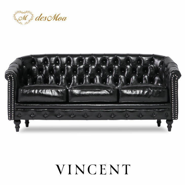 VINCENT ヴィンセントシリーズ ラウンジソファ 3人掛けソファ 3人用 トリプル コンパクト 英国アンティーク調 レトロ クラシカル おしゃれ かっこいい 店舗什器 応接 書斎 ディスプレイ レストラン ホテル サロン 木製 輸入家具 合成皮革 合皮 黒 シャインブラック VL3P51K
