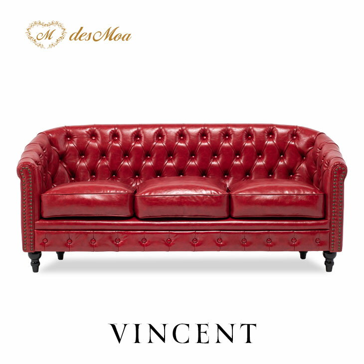 VINCENT ヴィンセントシリーズ ラウンジソファ 3人掛けソファ 3人用 トリプル コンパクト 英国アンティーク調 レトロ クラシカル おしゃれ かっこいい 店舗什器 応接室 書斎 ディスプレイ レストラン ホテル サロン 木製 輸入家具 合成皮革 合皮 赤 レッド VL3P63K