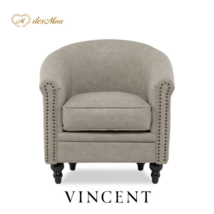 VINCENT ヴィンセントシリーズ ラウンジソファ 1人掛けソファ シングルソファー 1人用 コンパクト 英国アンティーク調 レトロ クラシカル おしゃれ かっこいい 店舗什器 応接室 レストラン カフェ ラウンジ ホテル サロン 木製 輸入家具 合成皮革 ライトグレー VLA1P101K