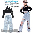 キッズダンス衣装 デニムパンツ ジーンズ ダメージパンツ セットアップ ヒップホップ へそ出し トップス 黒 韓国 かっこいい 練習着 110 170 女の子 発表会 プレゼント ギフト 新生活