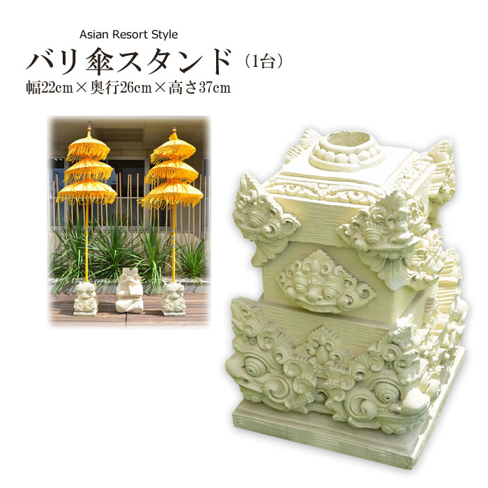 製造国 インドネシア 素材 セメント サイズ 幅22cm×奥行26cm×高さ37cm 差込口:直径5cm×深さ36.5cm 重量12〜13kg 関連 インドネシアバリ島で厳選買い付け! アジアン雑貨 置物 業務用 店舗用 ディスプレイ 祭礼 バリの傘 オブジェ 飾り パユン アジアンカフェ 飲食店 店舗様お勧め ※撮影小物は商品に含まれません。 ※入荷の時期により予告なく仕様が異なる場合がございます。 ※スタンド1台のみの販売です。バリ傘は付属しておりません。 ※手作り品の為サイズ・形・重さ・穴の大きさには個体差があります。 ※重量がありますので、移動の際は十分にお気を付けください。 ※姉妹店でも販売しておりますので、売り切れの場合はご了承下さい。 プレゼント包装は お受けできません ※大型商品および壊れやすい商品の プレゼント包装はご遠慮下さいませ。パユン/バリ傘 スタンド STO-0227 こてこてのバリ風の装飾には欠かせないバリ傘(パユン)用のスタンドです。 一般のご家庭にもリゾートガーデンのアクセントとしてもオススメです。 バリ風、アジアン風なレストランや エステサロンなどの店舗様、これから お店を開かれる方にもお勧めです! お店の入り口など両サイドに置くだけで、 現地のホテルやレストランのような 雰囲気になりますよ♪ 手作り商品のため、多少の個体差がございます。 ご理解のうえ、お買い求め下さい。 土台だっておしゃれにしたいですよね♪ 行事以外でも、バリ傘(パユン)は石像やお寺など幅広く使われており、 バリにはなくてはならない存在です。そんな、バリ島ならではの雰囲気を簡単に、 お気軽にお楽しみください^^ 【お買い上げの前にご確認ください】 ※手作り品のため、サイズ、細かい仕上げや模様、色使いに個体差があります。 ※屋外で使用される場合は転倒や風で飛ばさせないようご注意ください。 ※傘の棒が穴より細い場合は、何か詰め物などを入れ、風で飛ばされないよう、ご注意ください。 ※スタンド(台座)1点の販売となります。 ◆掲載のバリ傘はこちら◆ 3段220cm:ブラック 3段220cm:オレンジ 3段220cm:レッド 3段220cm:イエロー