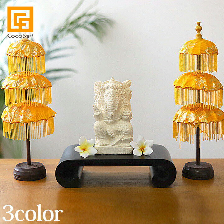 製造国 インドネシア 素材 布、アルベシアウッド サイズ 全長220cm 傘の直径 上段から50cm,58cm,68cm 関連 インドネシアバリ島で厳選買い付け! バリ雑貨 アジアン雑貨 アジア雑貨 エスニック アジアンテイスト リゾートインテリア ※撮影小物は商品に含まれません。 ※屋外撮影につき、実際の色と異なって見える場合がございます。 ※傘を立てる台座はございません。 ※傘部分は閉じた状態でのお届けとなります。 ディスプレイの際は傘を開いて、付属のつっかえ棒を穴に差し込んで留めてください。 ※民芸品レベルの作りになっておりますので、小キズや汚れ、作りな粗雑な部分などがございます。ご了承ください。 ※大型サイズの商品は他の商品と同梱できない場合がございます。 ※姉妹店でも販売しておりますので、ご注文頂いた商品が在庫切れの場合がございます。 ご了承下さいませ。バリ島の伝統的な装飾のバリ傘《パユン》。 華やかでエキゾチックな空間演出を♪ バリ島では行事の際の装飾として、またお寺などにも見られる、バリ傘(パユン)はバリ島にはなくてはならない存在です。 インテリアとして、、レストランやカフェ、ホテル、エステ、サロンなどの店舗様の内外装用の装飾としてもおすすめ! 【サイズ】 全長 220cm 上段傘の直径 50cm 中段傘の直径 58cm下段傘の直径 68cm 【素材】 布、アルベシアウッド ■バリ傘パユンを使用したイメージ画像■ カフェ・レストラン・結婚式場・サロンなどエントランスに刺しておくだけで、 雰囲気が一気にアジア風、バリ風に変わる簡単アイテムです♪ お買い上げの前にご確認ください! ※手作り商品の為サイズ、細かい仕上げや模様、色使いに個体差あります。 ※傘部分にゆがみあります。棒も真っ直ぐではなく多少曲がっています。 ※バリ島スカワティ地区のセレモニー用具店でオーダーしたものです。 現地祭礼で本当に使用する民芸品レベルの商品となり、歪みやホツレなどがある場合もございます。 ※屋外で使用される場合は転倒や風で飛ばされないようご注意ください。 ※内装・外装問わずお使いいただけますが、雨ざらしはオススメできません。 屋根のある場所や晴れの日にお使いください。 ※台座なし・傘のみの販売となります。 ※ディスプレイ用です。雨傘・日傘としてはお使い頂けません。 ▼アジアンなバリ傘(パユン)▼ ホワイト オレンジレッド イエロー 関連商品はこちらバリ傘スタンド《バロン》28cm×28cm×37c...7,300円石彫り ガーデンオブジェ 【花持ちカエ...15,300円バリ雑貨 石像 カエル 石彫り バリ島 睡...7,000円石彫り ガネーシャ像 石像 20x20x46cm ...40,000円石彫り ラクササ像 《 左右セット 高さ4...40,000円