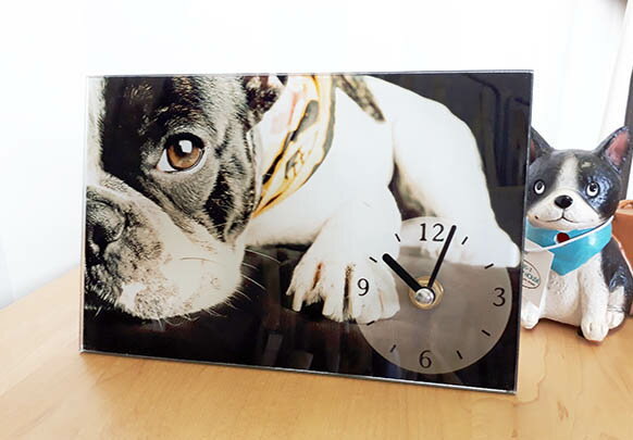 ガラスアートピクチャークロック【フレンチブル/ホワイト】置き時計 2デザイン フレンチブルドッグ リビング CLOCK 新生活 ギフト お祝い シンプル かわいい お洒落 写真 スタイリッシュ お手頃