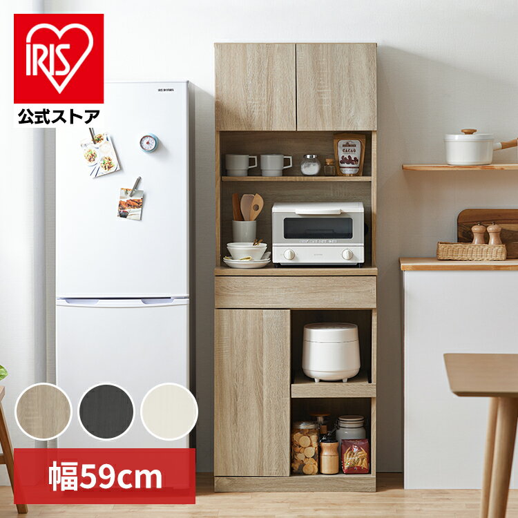 見せる収納と隠す収納、どんなお部屋にもなじむ木目調のデザインでワンランク上のキッチンへ。7つに分かれた収納スペースに、普段使う食器や調理器具・ストック食材をはじめ、コーヒーメーカーなどのキッチン家電まですっきり収まる収納力。背面にはコードを通せる配線穴が2カ所に、合計1500Wまで使用できる2口コンセントも付いており調理効率UPと時間短縮になります。収納内部の可動棚は細かく調節が可能なので、ご家庭によって異なる様々なものを上手に収納できます。また、地震対策の転倒防止プレートを取り付けることにより、安全を確保できて安心です。2梱包でお届けします。★お客様組立★●商品サイズ(cm)全体:幅約59×奥行約39.8×高さ約162.2●材質下段天板・下段固定棚・スライド棚:合成樹脂化粧繊維板(低圧メラミン)背板・下段引き出し底板・下段引き出し前板・下段扉:プリント紙化粧繊維板その他板:プリント紙化粧パーティクルボード●耐荷重(測定値)【本体上】上段収納可動棚板・上段固定棚板:5kgディスプレイ収納可動棚板:2kg、天板:20kg【本体下】下段収納引き出し・下段可動棚板・スライド棚板:5kg下段固定棚板:10kg●カラーブラック、ライトナチュラル、オフホワイト●組立についてお2人での組み立てをおすすすめします。インパクトドライバーは使用しないでください。破損するおそれがあります。※商品が完売となっていた場合、キャンセル又は注文内容の変更をお願いいたしております。予めご了承くださいますようお願いいたします。(検索用:キッチンラック・食器棚・ダイニングボード・キャビネット・木目調・キッチン家具・インテリア・おしゃれ・レンジ台・組立動画・4967576678254・4967576678247・4967576678230) 最強翌日配送対象商品に関するご案内 最強翌日配送対象商品・対象地域に該当する場合は最強翌日配送マークがご注文カゴ近くに表示されます。 最強翌日配送可能なお支払方法は【クレジットカード、代金引換、全額ポイント支払い】のみとなります。 下記の場合は最強翌日配送対象外となります。 ●15点以上ご購入いただいた場合 ●時間指定がある場合 ●ご注文時備考欄にご記入がある場合 ●決済処理にお時間を頂戴する場合 ●郵便番号や住所に誤りがある場合 ●最強翌日配送対象外の商品とご一緒にご注文いただいた場合 ●お届け先住所文字数が40文字以上の場合お届け先が沖縄・離島の場合、お届け日時のご希望に沿えない場合がございます。予めご了承ください。 商品ページはこちら ▸ 商品ページはこちら ▸ ▼雑草が生える前の今がチャンス!