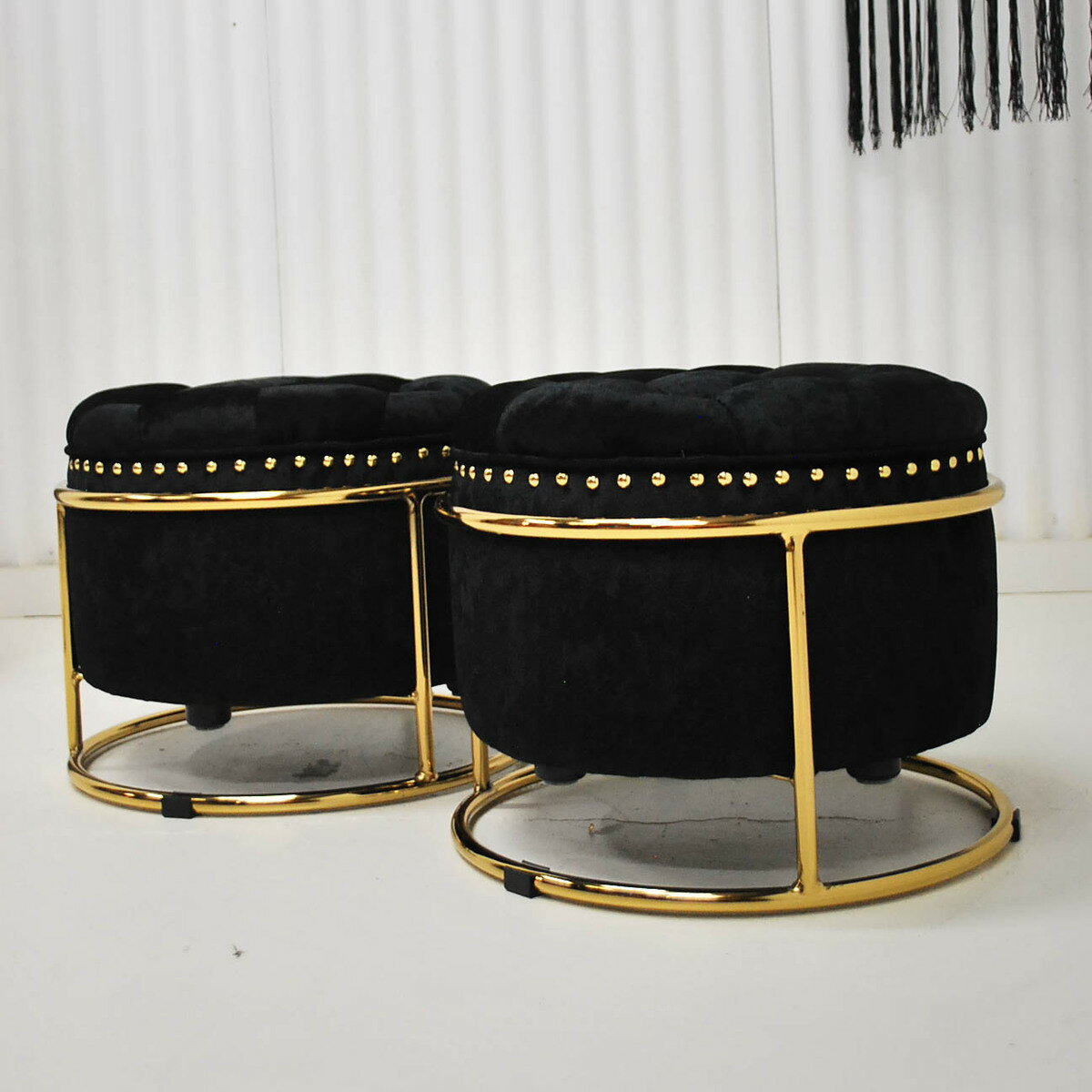 アウトレット 未使用 ラグジュアリー オットマン 2個セット 黒 ブラック スタッキングスツール ロイヤルブルー ゴージャス ベロア調 丸イス オシャレ ゴールド脚 化粧イス ドレッサー サロン インテリア 家具 一人掛け ミキインテリア