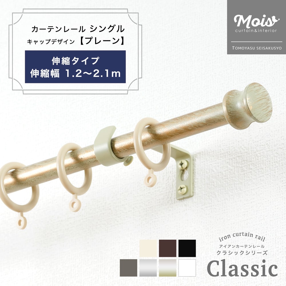 商品名 アイアンカーテンレール クラシックシリーズ伸縮レール [ 1.2〜2.1m ] シングル 【プレーン】 カラー ブラック、アンティークホワイト、ピュアホワイト、アンティークブラウン、シルバー、ゴールド、グレー サイズ 伸縮: シングル 1.2〜2.1m※付属品の寸法についてはこちら ≫ 素材 装飾キャップ:亜鉛ダイキャスト レール本体:スチール ブラケット:スチール リングランナー:樹脂 付属品 アイアンレール装飾キャップ取付ブラケット取付用木ビス(35mm)リングランナー※付属品の個数についてはこちら ≫ オプション品 壁際の窓やエアコンなどがある窓に!壁際用キャップ(別売) ≫ 装飾キャップ・リングランナーなどその他部品(別売) ≫ 生産国 台湾 商品の注意事項 ・必ず下地のしっかりした場所に取り付けてください。 ・石膏ボード用アンカーは標準付属品ではございません。 【オーダーのみ】 ・カットサイズの指定は1cm単位です。 ・ジョイント部分に必ずブラケットを置いてください。 【機能レール付ダブルのみ】 ・『伸縮レールとのダブル』のレース側の伸縮レールの伸縮幅は0.7〜1.2mサイズは0.6〜1.0m、1.2〜2.1mサイズは1.1〜2.0mとなります。アイアンカーテンレールの伸縮幅と異なりますのでご注意ください。 ・取付用ビス(ネジ径4mm/ネジ下32mm)は強度を高めるためにネジの径を太くしているのでダブルタイプの場合、内側のレールに入りづらい場合がありますが回しながら入れると入ります。 ご注文の注意事項 ・設置場所や閲覧環境により、表示されている画面上の色と実際の商品の色の見え方が異なる場合がございます。 ・商品開封後の変更・返品・交換は承っておりません。 ・欠品や品薄の場合は別途納期が掛かります。 予めご了承下さい。 ・出荷後の住所・送付先の変更は転送料が必要となりますので、ご注文前にお届け先住所を必ずご確認ください。 ・ご注文の前に当店のご注文規定を必ずご確認ください。ご注文の際は、こちらのページの内容をご理解いただいたものと判断させていただきます。 カーテンレール おしゃれ ダブル シングル 2連 ツイン 北欧 洋風 装飾 黒アイアン レール インテリア 装飾レール ホワイト 白 シルバー ゴールド アンティーク ヨーロピアン モダン インダストリアル デザイン レール 1本 2本 レースカーテン ドレープカーテンIron curtain rail classicアイアンカーテンレールクラシックシリーズ クラシカルなデザインの装飾キャップとカラーがおしゃれなリングランナータイプのアイアンカーテンレールです。葉っぱのデザインのリーフィーや洋風街灯デザインのトーチ、渦巻きデザインのフック、玉ねぎのようなデザインのボール、南欧風デザインのヘリックス、シンプルなプレーンなど8種類と豊富に取り揃えています。(天井付けセットはヘリックスを除く7種のデザインです)レールタイプを窓のサイズに合わせて長さをオーダーできる「サイズオーダー」とサイズ調整可能な「伸縮タイプ」の2種類からお選びいただけます。カーテンレールが1本のシングルレースカーテンを合わせたい窓にはダブル(伸縮レール付きダブル)とポールダブル(2連)をご用意しています。販売以来多くの方に選ばれ続けている弊社人気のオリジナルアイアンカーテンレールです。 デザイン【プレーン】 カラーが豊富で場所を選ばないシンプルな装飾カーテンレール。コンパクトなので設置しにくい場所でも安心。 Details商品詳細 商品名 アイアンカーテンレール クラシックシリーズ伸縮レール [ 1.2〜2.1m ] シングル 【プレーン】 カラー ブラック、アンティークホワイト、ピュアホワイト、アンティークブラウン、シルバー、ゴールド、グレー サイズ 伸縮: シングル 1.2〜2.1m※付属品の寸法についてはこちら ≫ 素材 装飾キャップ:亜鉛ダイキャスト レール本体:スチール ブラケット:スチール リングランナー:樹脂 付属品 アイアンレール装飾キャップ取付ブラケット取付用木ビス(35mm)リングランナー※付属品の個数についてはこちら ≫ オプション品 壁際の窓やエアコンなどがある窓に!壁際用キャップ(別売) ≫ 装飾キャップ・リングランナーなどその他部品(別売) ≫ 生産国 台湾 商品の注意事項 ・必ず下地のしっかりした場所に取り付けてください。 ・石膏ボード用アンカーは標準付属品ではございません。 【オーダーのみ】 ・カットサイズの指定は1cm単位です。 ・ジョイント部分に必ずブラケットを置いてください。 【機能レール付ダブルのみ】 ・『伸縮レールとのダブル』のレース側の伸縮レールの伸縮幅は0.7〜1.2mサイズは0.6〜1.0m、1.2〜2.1mサイズは1.1〜2.0mとなります。アイアンカーテンレールの伸縮幅と異なりますのでご注意ください。 ・取付用ビス(ネジ径4mm/ネジ下32mm)は強度を高めるためにネジの径を太くしているのでダブルタイプの場合、内側のレールに入りづらい場合がありますが回しながら入れると入ります。 ご注意 ・設置場所や閲覧環境により、表示されている画面上の色と実際の商