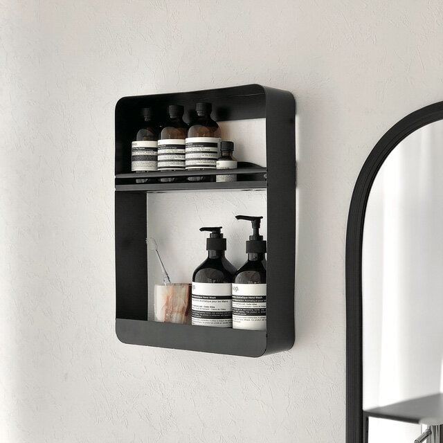 アイアンのウォールシェルフです。 2段に分かれた収納棚は、上下で高さが違う仕様になっています。 洗面所やキッチンなどの小物収納にいかがでしょうか。 背面2カ所の取付け部に、付属の部品かお手持ちのネジや釘等を使用し、飾るアイテムや壁の強度に合わせてお取り付け下さい。 ■素材 アイアン ■サイズ 幅約29.5cm×奥行約8cm×高さ約40cm 上段約15cm 下段約25cm 重量:1.3kg ※他のアイテム含め、荷物のサイズが変わる数量をお買い上げの場合に限り、送料変更がありますので別途ご連絡致します。