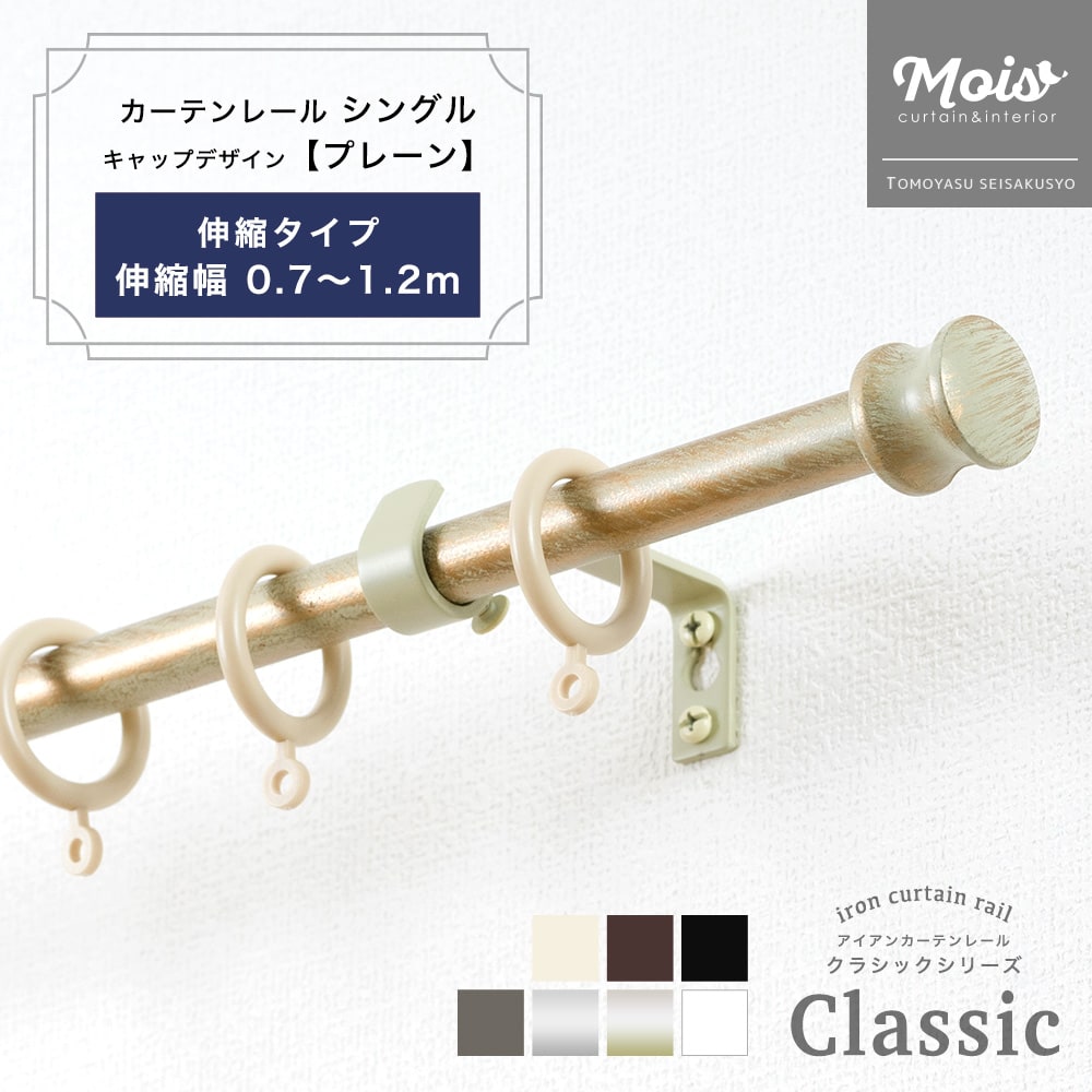 商品名 アイアンカーテンレール クラシックシリーズ伸縮レール [ 0.7〜1.2m ] シングル 【プレーン】 カラー ブラック、アンティークホワイト、ピュアホワイト、アンティークブラウン、シルバー、ゴールド、グレー サイズ 伸縮: シングル 0.7〜1.2m※付属品の寸法についてはこちら ≫ 素材 装飾キャップ:亜鉛ダイキャスト レール本体:スチール ブラケット:スチール リングランナー:樹脂 付属品 アイアンレール装飾キャップ取付ブラケット取付用木ビス(35mm)リングランナー※付属品の個数についてはこちら ≫ オプション品 壁際の窓やエアコンなどがある窓に!壁際用キャップ(別売) ≫ 装飾キャップ・リングランナーなどその他部品(別売) ≫ 生産国 台湾 商品の注意事項 ・必ず下地のしっかりした場所に取り付けてください。 ・石膏ボード用アンカーは標準付属品ではございません。 【オーダーのみ】 ・カットサイズの指定は1cm単位です。 ・ジョイント部分に必ずブラケットを置いてください。 【機能レール付ダブルのみ】 ・『伸縮レールとのダブル』のレース側の伸縮レールの伸縮幅は0.7〜1.2mサイズは0.6〜1.0m、1.2〜2.1mサイズは1.1〜2.0mとなります。アイアンカーテンレールの伸縮幅と異なりますのでご注意ください。 ・取付用ビス(ネジ径4mm/ネジ下32mm)は強度を高めるためにネジの径を太くしているのでダブルタイプの場合、内側のレールに入りづらい場合がありますが回しながら入れると入ります。 ご注文の注意事項 ・設置場所や閲覧環境により、表示されている画面上の色と実際の商品の色の見え方が異なる場合がございます。 ・商品開封後の変更・返品・交換は承っておりません。 ・欠品や品薄の場合は別途納期が掛かります。 予めご了承下さい。 ・出荷後の住所・送付先の変更は転送料が必要となりますので、ご注文前にお届け先住所を必ずご確認ください。 ・ご注文の前に当店のご注文規定を必ずご確認ください。ご注文の際は、こちらのページの内容をご理解いただいたものと判断させていただきます。 カーテンレール おしゃれ ダブル シングル 2連 ツイン 北欧 洋風 装飾 黒アイアン レール インテリア 装飾レール ホワイト 白 シルバー ゴールド アンティーク ヨーロピアン モダン インダストリアル デザイン レール 1本 2本 レースカーテン ドレープカーテンIron curtain rail classicアイアンカーテンレールクラシックシリーズ クラシカルなデザインの装飾キャップとカラーがおしゃれなリングランナータイプのアイアンカーテンレールです。葉っぱのデザインのリーフィーや洋風街灯デザインのトーチ、渦巻きデザインのフック、玉ねぎのようなデザインのボール、南欧風デザインのヘリックス、シンプルなプレーンなど8種類と豊富に取り揃えています。(天井付けセットはヘリックスを除く7種のデザインです)レールタイプを窓のサイズに合わせて長さをオーダーできる「サイズオーダー」とサイズ調整可能な「伸縮タイプ」の2種類からお選びいただけます。カーテンレールが1本のシングルレースカーテンを合わせたい窓にはダブル(伸縮レール付きダブル)とポールダブル(2連)をご用意しています。販売以来多くの方に選ばれ続けている弊社人気のオリジナルアイアンカーテンレールです。 デザイン【プレーン】 カラーが豊富で場所を選ばないシンプルな装飾カーテンレール。コンパクトなので設置しにくい場所でも安心。 Details商品詳細 商品名 アイアンカーテンレール クラシックシリーズ伸縮レール [ 0.7〜1.2m ] シングル 【プレーン】 カラー ブラック、アンティークホワイト、ピュアホワイト、アンティークブラウン、シルバー、ゴールド、グレー サイズ 伸縮: シングル 0.7〜1.2m※付属品の寸法についてはこちら ≫ 素材 装飾キャップ:亜鉛ダイキャスト レール本体:スチール ブラケット:スチール リングランナー:樹脂 付属品 アイアンレール装飾キャップ取付ブラケット取付用木ビス(35mm)リングランナー※付属品の個数についてはこちら ≫ オプション品 壁際の窓やエアコンなどがある窓に!壁際用キャップ(別売) ≫ 装飾キャップ・リングランナーなどその他部品(別売) ≫ 生産国 台湾 商品の注意事項 ・必ず下地のしっかりした場所に取り付けてください。 ・石膏ボード用アンカーは標準付属品ではございません。 【オーダーのみ】 ・カットサイズの指定は1cm単位です。 ・ジョイント部分に必ずブラケットを置いてください。 【機能レール付ダブルのみ】 ・『伸縮レールとのダブル』のレース側の伸縮レールの伸縮幅は0.7〜1.2mサイズは0.6〜1.0m、1.2〜2.1mサイズは1.1〜2.0mとなります。アイアンカーテンレールの伸縮幅と異なりますのでご注意ください。 ・取付用ビス(ネジ径4mm/ネジ下32mm)は強度を高めるためにネジの径を太くしているのでダブルタイプの場合、内側のレールに入りづらい場合がありますが回しながら入れると入ります。 ご注意 ・設置場所や閲覧環境により、表示されている画面上の色と実際の商
