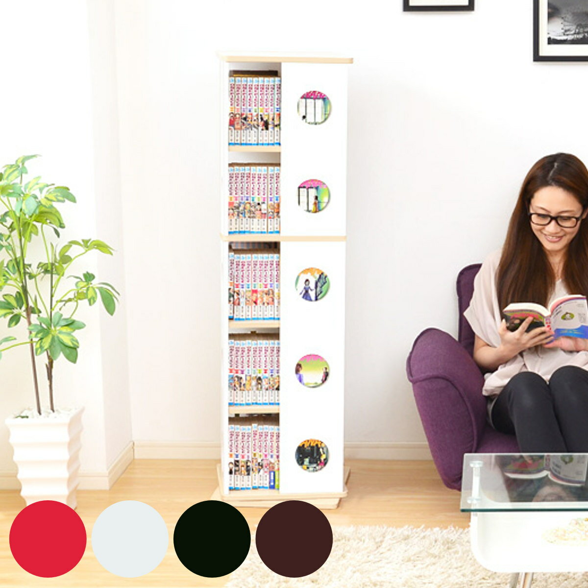 サイズ約 幅34×奥行34×高さ168(cm)重量約 20kg内容量1台付属品:ネジ穴隠しシール材質構造部材:MDF表面加工:ウレタン樹脂加工種類ホワイト、ダークブラウン、ブラック、レッド棚板1枚あたり耐荷重10kg組立状態お客様組立品注意事項※底面を壁から前後左右6.5cm以上離して設置していただくとスムーズに回転します※商品ページ内には別の商品を含む画像を使用しています区分返品・キャンセル区分(不可)回転コミックラック 幅34cm 7段 ブックシェルフ 本棚 高さ168cmおすすめポイント本が探しやすい回転式コミックラック 7段読みたい本を手に取りやすい回転コミックラックです。くるくると360度回転するので、少ないスペースで大量の本が収納でき、簡単に本を探すことができます。ソファやベットから、手を伸ばして読みたい本を取り出せてとても便利です。コレクションが楽しくなるデザイン丸い窓からは、お気に入りのコミックの表紙が見えます。シリーズでずらっと綺麗に並べることができるので、コレクションが楽しくなります。商品詳細大容量の収納力高さは168cmと手の届きやすい高さです。収納場所に困る大量の漫画やCDも、このコミックラックでまとめて収納できます。コミックは約250冊、CDは約390枚、DVDは約280枚収納していただけます。※一般的なサイズの物を基準とした参考数量ですコンパクトで省スペース最大幅47cmとコンパクトな設計で、置き場所に困りません。大量の本をスマートに収納して、お部屋を広々とお使いいただけます。様々なシーンで使えるダイニングでレシピ本や調味料を収納するインテリアラックとしてや、子ども部屋のおもちゃを飾るディスプレイラックとしてなど様々なシーンで活躍します。回転しても安心の設計細部の安全性に配慮しており、各棚下にはメタルバーをクロスさせてしっかりと支え、ベース部分は厚さ約1.5cmと頑丈な作りです。カラーサイズサイズ違いコミックラック5段コミックラック7段関連キーワード:大容量 コミック収納 黒 赤 レッド ブラウン ダークブラウン 茶 シンプル すき間 隙間収納 コンパクト 隙間 幅35 奥行35 高さ165 170 cm センチ お家時間 回転する 整理 本 コミック マンガ 漫画 文庫 DVD CD ナチュラル 漫画収納 CD収納 新生活 一人暮らし ひとり暮らし ワンルーム 学生 LH17643関連商品はこちら回転コミックラック 幅34cm 5段 ブックシ11,980円回転式 コミックラック 8段 ブックシェルフ 12,880円回転コミックラック 7段 ブックシェルフ 幅311,580円回転式 コミックラック 6段 8段 ブックシェ10,980円~回転コミックラック 5段 ブックシェルフ 幅39,980円回転 コミックラック 7段 マガジンラック付 14,960円回転式 コミックラック DVDラック 5段 高10,780円回転式 コミックラック 高さ182cm 8段 13,480円回転式 コミックラック 高さ138cm 6段 10,680円スライド本棚 幅89cm 4段 ダブルスライド11,180円回転式 コミックラック 7段 幅46.5cm 22,380円回転式 コミックラック 3段 幅39cm 1010,080円