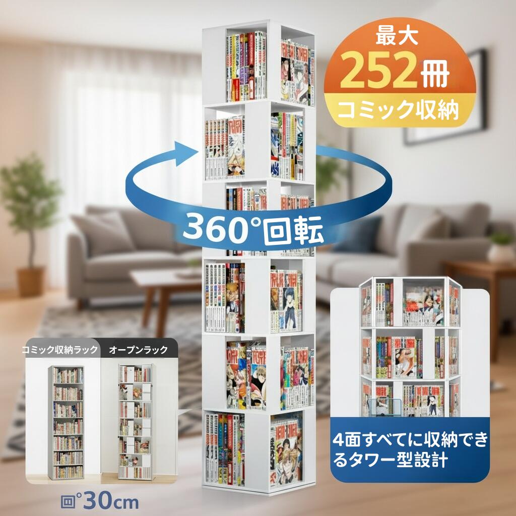 送料無料 回転本棚 6段 スリム 回転 360度 コミックラック ハイタイプ 書棚 大容量 ブックラック整理棚 おしゃれ 幅34cm×奥行34cm×高さ190cm 多目的ラック 角置き可 CDラック コンパクト 組立品 木製 4色(ホワイト ブルー ナチュラル ブラック)