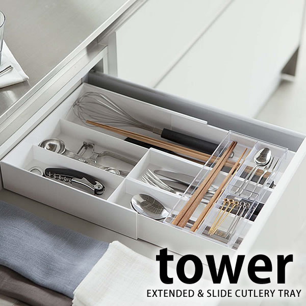 【2月20日ポイント最大10倍祭】tower カトラリートレー 伸縮&スライド 整理 収納 調理器具 スライド 引き出し スプーン 便利 フォーク キッチンツール ホワイト ブラック 山崎実業 タワー