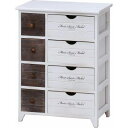 【返品種別A】□「返品種別」について詳しくはこちら□【不二貿易製品のお問い合わせにつきまして】ご購入前の仕様確認、およびご購入後の初期不良・不具合などのアフターサポートにつきましては、下記にお問い合わせください。[不二貿易株式会社 お問い合わせ窓口]:不二貿易株式会社>Contact■外箱について梱包サイズが大きい為、配送中に外箱に汚れや傷が生じる場合がございます。誠に申し訳ございませんが、外箱のみの汚れや傷による商品の交換や返品は受け付けておりません。(商品に破損・欠品があった場合は、その限りではございません。)フレンチシャビーなアンティークチェスト◆フレンチデザインホワイトウォッシュで仕上げたアンティークフレンチを思わせるおしゃれなデザイン。ブラウンカラーもアクセントに。◆たっぷり収納引き出し内寸28×25.5×12cmのボックスは深さもあるので、用途に応じてたっぷり収納できます。◆小物も分けて引き出し内寸13.5×25.5×12cmのボックスにはハンドタオルや靴下などサイズの小さな小物をスッキリ収納♪◆天板も広々幅84×奥行32.5cmの天板は作業スペースやディスプレイスペースとしても使えます。◆どこでもお好みの場所でキッチンやバスルーム、子供部屋など様々な場所でお使いいただけます。◆メリット多数の桐素材湿気に強く、防カビ・防虫性があるので日本の気候にもピッタリ! ■ 仕 様 ■本体寸法:幅840×奥行325×高さ710mm構造部材(天板):繊維板[ポリウレタン塗装]構造部材(フレーム):天然木(桐)[ラッカー塗装]構造部材(引出):天然木(杉)引出:3列×4段ブラシでWHウォッシュに仕上げ完成品組立:完成品[38049フジボウエキ]不二貿易生活家電>収納家具>チェスト・衣類ケース・衣類収納>チェスト(タンス)