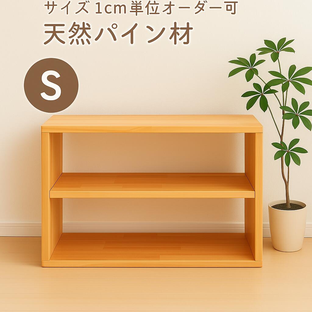 オーダーメイドSサイズ対応 天然パイン材 2段オープンラック 奥行・高さ・横幅1cm単位指定可 無塗装 木製収納棚 幅サイズ自由 シンデレラフィット ジャストフィット 本棚 ディスプレイラック 収納家具 日本製 完成品、要組立品の選択可能。