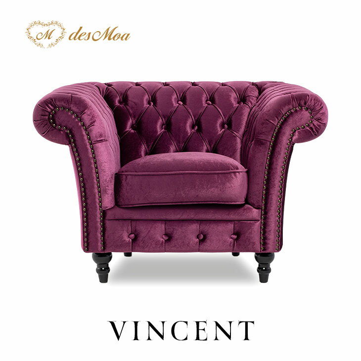 ソファー 1人掛けソファ シングルソファ パーソナルソファ 1P VINCENT ヴィンセントシリーズ VJシリーズ 英国アンティーク調 コンパクト チェスターフィールド クラシック レトロ おしゃれ エレガント 可愛い 布地 輸入家具 店舗什器 撮影什器 紫 ロイヤルパープル VJ1F222K