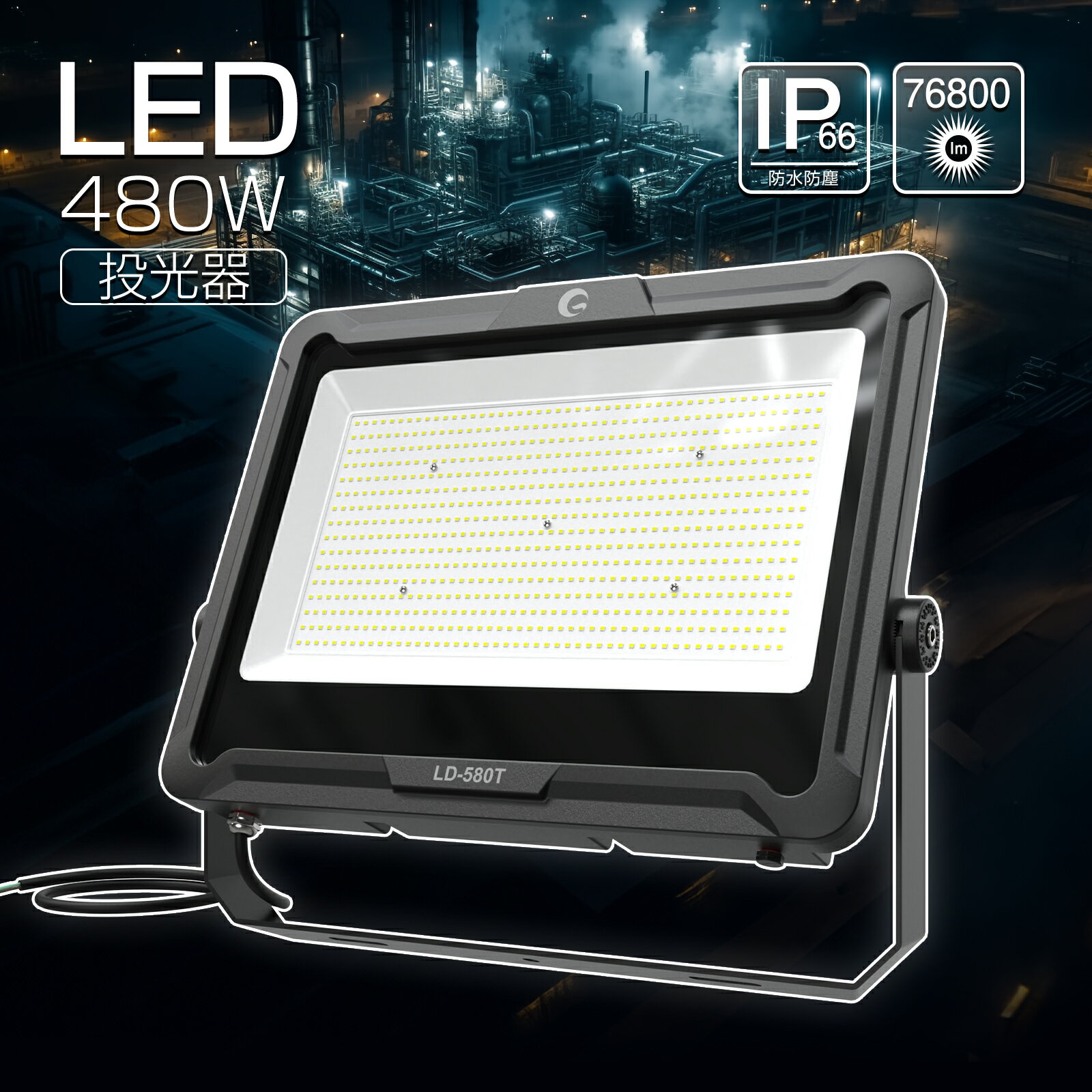 【ブラックフライデーP2倍&限定クーポン】GOODGOODS LED投光器 480W 76800lm 60M 中長距離照射 広角 倉庫 駐車場 工場 照明 店舗 屋外 作業灯 昼白色 強化ガラス 防水 防塵 耐風 耐震 明るい イベント ステージ ライトアップ 耐雷サージ (LD-580T)