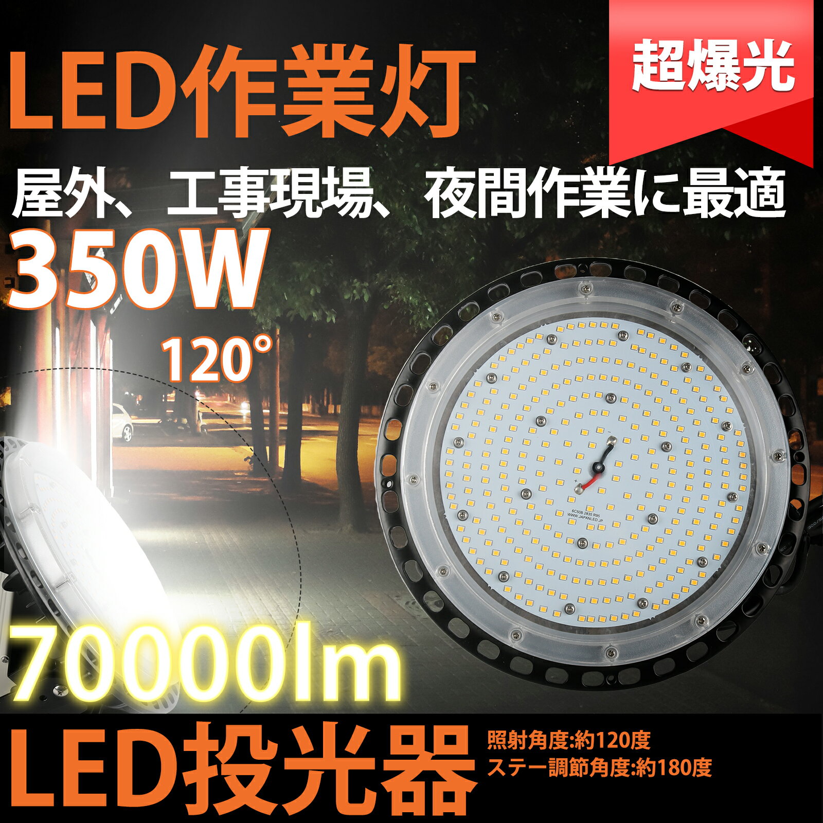製品仕様 ●商品名 TENUFO-350W-N ●商品状態 正規品、新品(未使用) ●ビーム角度 120度 ●消費電力 350W ●全光束 70000LM ●色温度 昼白色5000K 昼光色6000K ●平均演色評価数 Ra>82以上 ●防塵・防水等級 IP65 ●材質 強化ガラス +アルミ+MEANWELL電源IP67 ●周波数 50-60Hz ●動作保障温度 ‐20~45℃ ●入力電圧 AC86-265V(100-200V兼用) ●重量 13KG ●サイズ 450*450*300mm ●設計寿命 50000H ●保証期間 2年 高天井用LED 壁掛け照明 天井吊り下げ ※ ステー付き 角度調節 屋内・屋外兼用 防塵・防湿・防水 独創性あふれるデザイン 業界高水準となる発光効率200lm/Wを実現 超明るい 幅広い使用範囲 トンネル、掲示板、ガソリンスタンド、夜間作業、現場工事、駐車場、公園、運動場にも様々な場所で活躍します。 認証と保証 日本の電気や材料セキュリティ法などの規則を適用されて、EMCとPSE認証準拠、及び雷サージ、静電、騒音発射、騒音遮断、フリッカー、難燃タイプ、絶縁Aタイプ 。 ※保証期間は発送された日から換算して2年間です。万が一不具合の商品が届きましたら、お気軽にメールにて弊店へご連絡ください。24時間以内に急速対応いたします。 *経年劣化及びお客様ご自身の都合や使用による破損、故障等は保証の対象外です。 ※ご注意※ ●取付*取外しは必ず電源を切った状態で行なってください。led作業灯100w led作業灯150w led作業灯200w led投光器100w led投光器150w led投光器200w led投光器250w led投光器350w led投光器450w 【led作業灯100w セット販売】 【led作業灯150w セット販売】 【led作業灯200w セット販売】 【led作業灯250w セット販売】 【led作業灯350w セット販売】 【led作業灯450w セット販売】 【特徴】 ◆即時点灯、目に優しい! 低電力、高輝度、点灯遅延無しで、点灯直後から一気に最大の明るさになる。ちらつきやノイズがほとんど無いため、目に優しく、周囲の電子機器へのノイズの影響がありません。 ◆電気代安くなり、コスパ最高!節電! 省エネ、LEDライトは従来の蛍光灯より消費電力が少ないため、替えたその日から消費電力を減らし、家計に優しい照明器具です。 LED化で賢く節約!本製品に替えるとこんなにお得です! 電気料金の差は圧倒的!!電気代が半分: 通常の蛍光灯の1/2の消費電力で、電気代が大幅に節約できます 。 ◆長寿命約50,000時間(※約10年交換不要) 表示は設計寿命であり、製品の寿命を保証するものではありません。(1日12時間点灯の場合) 。 ◆安全素材 防錆性鋳造アルミニウム、アルミ合金放熱+強化ガラス(安全性よい) 電源:高機能 、IP67防水抜群のMEANWELL電源 採用 LEDチップ:日本製素子 5Mコード付き 防災のために、避雷型を付きますの独特の設計、安全係数が高いのLED高品質投光器。 ◆抜群の視認性 視認性の高い白い光で対象物をすっきりくっきり照射します。 LED蛍光灯に変えることにより、きっと明るく過ごしやすい空間を作れます。 ◆高耐久性! アルミ合金で造った熱を逃がす構造にして、放熱性を大幅にUP!通常の蛍光灯の約5倍長寿命、交換の手間も少なくてすみます。 本体は、放熱性の高いアルミニウムを採用し、放熱効率をより高くしております。 照射面は、耐熱性に優れており、強化ガラスを採用しているため、 長時間の使用も安心してご利用いただけます。 ◆虫が寄りにくい(マイマイ蛾対策) LEDは紫外線を含む光を出さないので、虫が寄りにくい光源です。 近年大量発生しているマイマイ蛾対策にも有効です。 ◆チラツキなし,ノイズなし,電磁波障害なし 監視カメラやwebカメラではチラツキが全然ありません。近視を防ぐのため目に優しいです。 EMI(ノイズ対策)CISPR 15/VCCICLASS Bに準拠 日本のEMC155013標準に適う。人体の影響がありません。安心に使用できる。 ◆環境にやさしい 製品の素材はすべてリサイクル可能(有害物質を含みません)環境にやさしいエコ照明です。 水銀などの環境有害物質は一切使用しないのは当然のこと、省エネ効果によるCO2の削減など、 生産から稼働まで常に地球に優しくなっています。 ◆安全性 弊社のLED商品は全部PSE取得済、ノイズ対策済、国際ノイズ規格のCISPR15に準拠! 安全性が高い、安心してご使用いただけます。既存器具に取 ノイズ傍受、フリッカ、難燃試験、絶縁A階級など、 国内、国外の安全規格、認定を取得済みます。 ◆幅広い使用範囲 トンネル、掲示板、ガソリンスタンド、夜間作業、現場工事、駐車場、公園、運動場にも様々な場所で活躍します。 検索関連ワード(本製品の説明ではありません):LED投光器200W LED 投光器 投光機 ワークライト LEDチップ LED投光機 LED照明 野外灯 作業灯 集魚灯 看板灯 屋内 屋外 照明 倉庫 船舶 トラック 荷台 防犯灯 駐車場灯 アウトドア ナイター 多用途 省エネ 防水 50W 80W 100W 150W 200W 300W 400W 500W 600W 900W 1200W 夜間照明 夜間照明 屋外 看板灯 看板灯 led 看板灯 おしゃれ 看板灯 オーデリック 看板灯 アーム led 看板灯 ledランプ 看板灯 ソーラー 看板灯 スポットライト 夜間照明 室内 夜間照明 工事 夜間照明 led 屋外照明 屋外照明 コンセント式 屋外照明