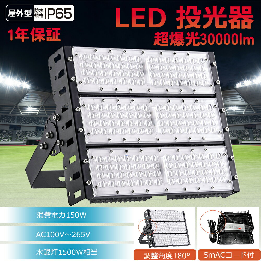 超爆光 LED投光器 LED投光機150W 30000lm IP65 防水 省エネタイプ ワークライト 電球色3000K 昼白色5000K 昼光色6000K LED照明 角度調節可能 ステー付き 投光器 屋外 高演色Ra85 長寿命 LED PSE認証 150W 照明 虫ガード 防震 船舶 集魚灯 LED作業灯 駐車場灯 防犯灯