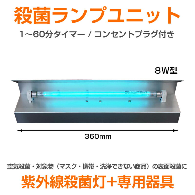ウイルス感染対策に。殺菌ランプ付きの専用ユニットです。空気除菌や対象物(携帯・マスク・手袋・洗浄できない商品など)を除菌するのに最適です。殺菌ランプは、菌やウイルス対しては、大きな効果が期待できる殺菌力の高い紫外線を強力に放出します。 飲食店の厨房などへの設置で大変ご好評頂いております。 1〜60分の範囲で任意に設定できるタイマー付きで消し忘れも無く安心です。コンセントソケットコード付きですのでコンセントに差し込んですぐに使えます。 反射笠で前方に効率よく放射するとともに、紫外線が目に入らないように上部・側面への放射を抑えた安全設計です。 ■6W型(GL-6WUT)仕様 サイズ:283×70×90mm コード長:1.5m ランプ:東芝GL-6 ランプ定格寿命:4,000h ランプサイズ:φ16×210mm 定格ランプ電力:6W 紫外線出力:1.7W 紫外線照射強度:19μW/Cm 電圧:AC100V 50/60Hz ■8W型(GL-8WUT)仕様 サイズ:360×70×90mm コード長:1.5m ランプ:東芝GL-8 ランプ定格寿命:4,000h ランプサイズ:φ16×287mm 定格ランプ電力:8W 紫外線出力:2.5W 紫外線照射強度:27μW/Cm 電圧:AC100V 50/60Hz 備考:ON/OFFスイッチ付き、タイマー(1〜60分)付き、コンセントプラグ付き配線 【使用上の注意】 点灯中のランプは直接肉眼で見ないでください。反射光も目に入らないようにしてください。 紫外線を直接皮膚に当てないでください。 紫外線(殺菌灯)は、目の痛み・視力障害・皮膚の炎症・日焼けの原因となります。 対象物においても、長時間の照射で、色味の退色や化成品の劣化が起こります。 【コロナ対策助成金・補助金等で領収書がご入用の方へ】 新型コロナウイルス感染予防対策ガイドラインの指針等で本製品をご利用頂く際、助成金・補助金がご利用いただける場合がございます。その場合、国や県が助成する感染予防対策費等をご利用され、領収書が必要な場合、楽天市場のシステムにてご購入後の購入履歴から領収書を発行頂けます。詳しくは下記ヘルプにてご確認ください。 https://ichiba.faq.rakuten.net/detail/000006734 また、コンビニ決済等をご利用の場合、お支払い時にご注文者名での領収書をお受け取り頂く形となりますので、その際はご注文時にご注文者名を会社名等に変更の上ご注文ください。 また、購入確認書類等でメール内容をご利用いただける場合もございます。その場合でも宛名がご注文者名となりますので、ご注文の際にご変更ご確認頂ますようお願いいたします。 助成金・補助金等の申請方法については弊社ではわかりかねますのでお手数ですが申請先の窓口までお問い合わせください。感染防止対策グッズ ■マスク除菌に アルコール消毒液 繰り返し使うマスクの除菌にご利用ください。入荷次第在庫アップしますので完売の際はお気に入り等に入れてお知らせをお待ち下さい。 ■様々な場所の除菌に 次亜塩素酸水 高濃度500ppmで薄めて大容量でお使い頂けます。様々な場所の消毒・除菌に。 ■飛沫防止対策 アクリルパネル板 スタンドで自立します お店やオフィスでの飛散防止に。透明度の高いアクリルパネルのついたて。開口あり・なし、サイズ別にラインナップを取り揃えました。 ■小物の除菌等に 紫外線UV殺菌ライト 小物などの殺菌にご利用いただける殺菌灯。光を直視しない等、取り扱いにはご注意ください。