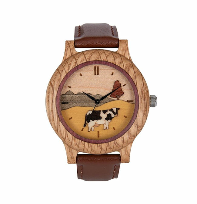 【送料無料】日本製 木製 腕時計 寄木タイプ 牧場・牛 ナラ 天然木 寄木 木目 時計 watch プレゼント 贈り物 ギフト