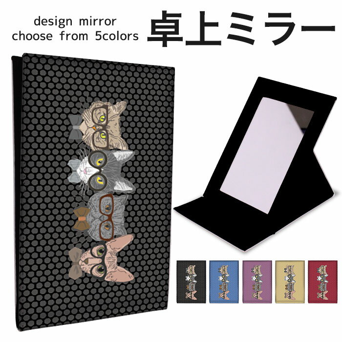 折りたたみ ミラー 卓上ミラー 鏡 メイク直し 手鏡 コンパクトミラー オリジナルデザイン 化粧鏡 お洒落 スタンドミラー 置き鏡 レザー ねこ めがね 蝶ネクタイ イラスト