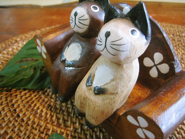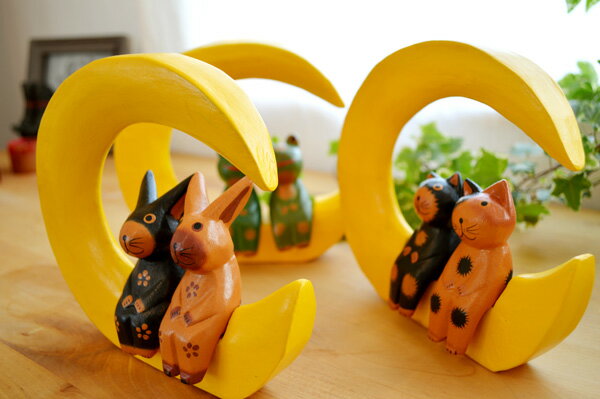 ★レビューで特典★アジアン バリ 猫 雑貨 カエル グッズ 置物 (三日月に乗ったアニマルカップル(M)(ネコ/カエル/ウサギ)) アジアン雑貨 オブジェ ネコ ウサギ 結婚祝い 木製 リゾート トライバル ホテルライク バリ風