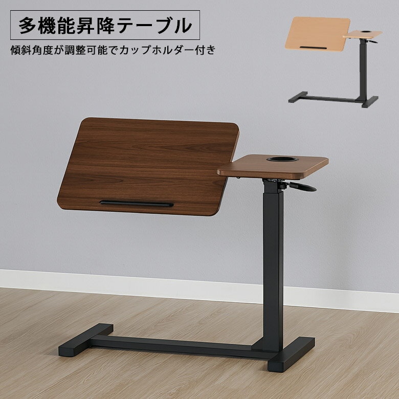 【最大100円offクーポン配布中!!】 サイドテーブル 昇降テーブル ナイトテーブル 電動ベッド用 幅90cm キャスター付き カップホルダー付き コンパクト ベッドサイド ブラウン ナチュラル オーク突板 スチール粉体塗装 ウレタン塗装