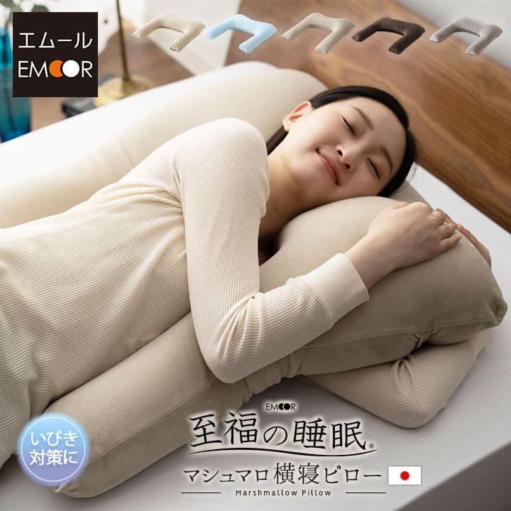 STAFF VOICE -スタッフおすすめポイント- 本当に気持ちいい“眠り”を 体験したことがありますか? 至福の睡眠とは? 睡眠研究に力を入れている寝具メーカーEMOORが生み出した大人気『至福の睡眠』シリーズから、横向き寝をサポートする「マシュマロ横寝ピロー」が誕生しました。 〜眠りの原点 それは“至福”〜 毎晩寝るのが待ち遠しい、そんな至福の睡眠をもたらすあたらしい枕です。 「横になった瞬間から朝までとにかく気持ちいい」がコンセプト。 睡眠研究の観点から科学的に、そして何よりもユーザーの使い心地をとことん追求しました。 Point.1 贅沢なオール極小ビーズ 横寝ピローの中身は、すべて高密度の国産極小ビーズ。 余計な綿等を配合していないので、広い面積の枕の中で360°立体的に流動。 あなたの体型や寝姿勢に合わせて優しくフィットします。 今までの枕にはない、思わず抱きしめたくなるとろけるような気持ちよさと、カラダ全体を支えられる安心感が味わえます。 Point.2 こだわりの立体構造 横寝ピローは、首・肩だけでなく腕まで支えるアームクッション付きのまくらです。 独自の立体キルト構造と流動する極小ビーズにより、仰向け寝・横向き寝どちらの寝姿勢にもフィットして独自の浮遊感を味わえます。 Point.3 横向き寝にも感動を 横向き寝の際は、抱き枕としてアームクッションを使うことで、身体全体を包まれるような安心感が得られ、自然と体の力が抜けていきます。 横向き寝は、妊娠中の寝姿勢、いびき防止や閉塞性の睡眠時無呼吸症候群の緩和に有効と言われていますが、寝姿勢が安定しにくい欠点がありました。 横寝ピローは横向き寝が苦手な方にもおすすめです。 Point.4 気持ちよさを追求したカバー 通常のカバー生地では固すぎて、ビーズの流動性が失われがち。 マシュマロ横寝ピローは触れた瞬間、気持ちいいと感じるカバーを2種類ご用意。 滑らかでやや起毛しているしっとりカバーと、さわやかな触り心地が気持ちいいさらさらカバー。 季節やお好みに合わせてお選びください。 ※PC環境により実際のカラーと多少異なることもございます。ご了承ください。 商品詳細 品名 至福の睡眠 マシュマロ 横寝ピロー サイズ 約幅66×奥行70cm 最大の厚み:約15cm 組成 カバー(しっとり):ポリエステル93%、ポリウレタン7%(ベロア) カバー(さらさら):レーヨン95%、ポリウレタン5%(レーヨン) 中袋:ポリエステル95% 、ポリエウレタン5% 中材:発泡ポリスチレンビーズ カラー しっとりグレー・しっとりブラウン・しっとりベージュ・しっとりブルー・さらさらグレージュ 仕様 ファスナー開閉式 重量 総重量:約1.0kg ビーズ重量:900g お手入れ方法 カバー:ご家庭の洗濯機でお洗濯できます。 ※洗濯ネットをご使用ください。 製造国 日本製(国産) 配送 こちらの商品は送料無料です。