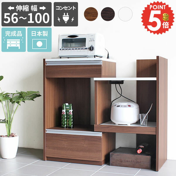 レンジ台 60幅 伸縮 電子レンジ台 レンジボード 完成品 隙間収納 食器棚 おしゃれ スリム ロータイプ 大型レンジ対応 キッチンボード レンジラック 作業台 90幅 幅85cm コンセント付 北欧 食器収納 コーナーラック キッチン棚 【約幅56〜100cm奥行き44cm高さ90cm】 ☆