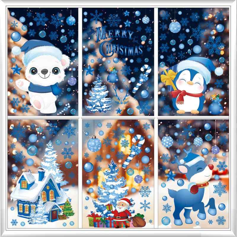 ウォールステッカー クリスマス 窓用 防水 PVC素材 雪だるま 雪の結晶 ブルー かわいい デコレーション リビング 寝室 玄関 店舗用