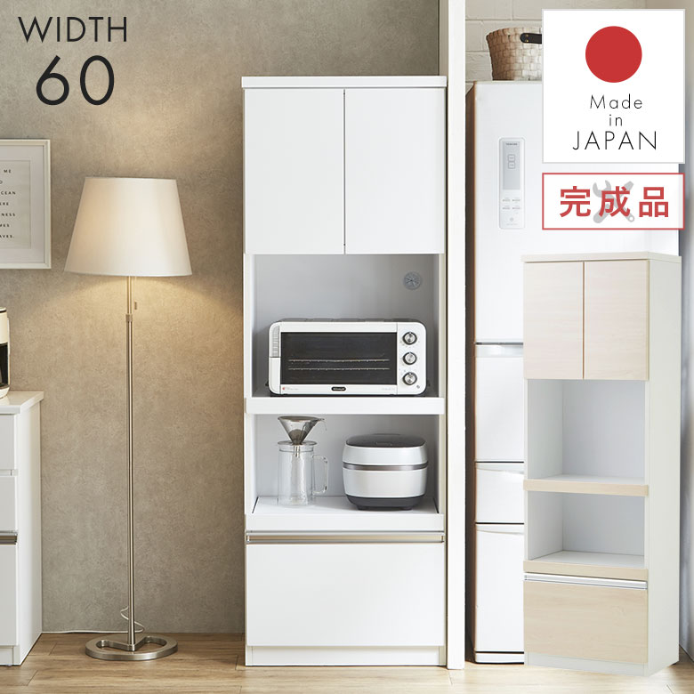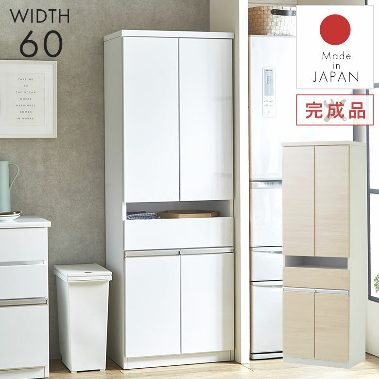 食器棚 レンジ台 キッチンボード 白 カップボード 幅60 スリム 完成品 日本製 おしゃれ 北欧 モダン シンプル ナチュラル 高級感 キッチンキャビネット キッチンラック キッチンストッカー 棚 キッチン収納 台所 引き出し 新生活 光沢 AQA