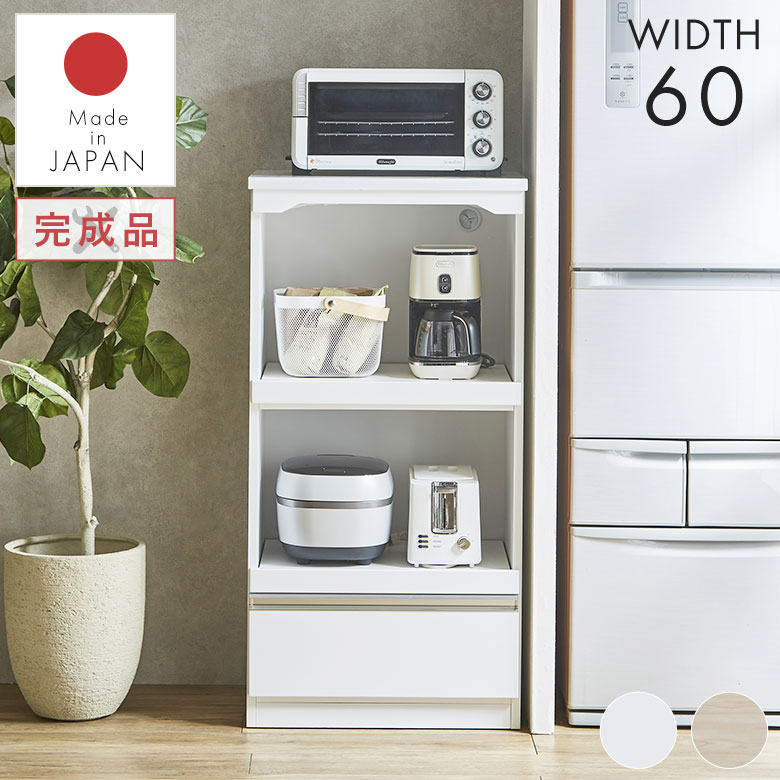 レンジ台 キッチンカウンター キッチン収納 食器棚 スリム コンパクト 白 幅60 完成品 日本製 おしゃれ 北欧 モダン シンプル ナチュラル 高級感 カップボード 棚 作業台 大容量 台所 引き出し 新生活 一人暮らし 光沢 艶有り AQA