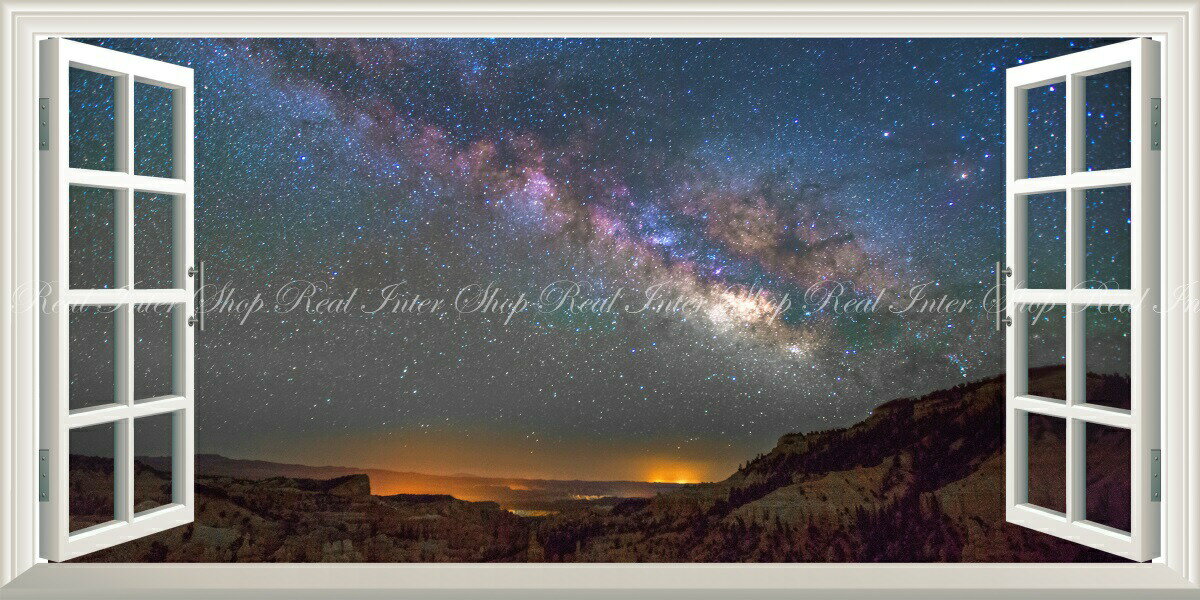 絵画風 壁紙ポスター (はがせるシール式) -窓の景色- 天の川 ブライスキャニオン ユタ州 おとぎの国峡谷 天体 宇宙 神秘 パノラマ 【窓仕様/トリックアート】 キャラクロ GLXY-003MS1 (1152mm×576mm) <日本製> ウォールステッカー お風呂ポスター