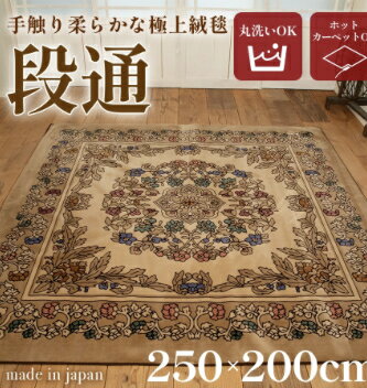 【訳あり 絨毯 ラグマット 3畳 長方形 250cm×200cm 丸洗いOK】染めた糸をジャガード機で織り上げた金華山織緞通カーペット。ラグの柄は、単にプリントするのではなく、各色に染めた糸を紋紙(柄の指図書)の通りジャガード機で織り上げています。日本の着物の織り方とよく似ていて、紋紙の指図通り、柄になる糸が選別され、織りあげれていく様子は、オルゴールのシリンダーのポツポツしたピンが櫛歯をはじいて音を奏でているように見えます。*丈夫な素材で、しかもソフトな肌触りが一段とお楽しみいただけます。 またコンパクトに折りたためて収納もラクラクです。*和・洋室にもマッチし、オールシーズン使用に耐える高密度織じゅうたんです。*商品の性質上、折りたたみジワがありますが、ご使用とともに目立ちにくくなります。 *和・洋室にもマッチし、オールシーズン使用に耐える高密度織じゅうたんです。■ サイズ250cm×200cm注意:モニター発色の具合により、実際の色味と異なる場合がございます【レビュー投稿頂いただいた方に10%OFFクーポンプレゼント中】【あす楽で翌日お届け可能】あす楽対応地域は、以下のとおりです。 東京都・神奈川県・埼玉県・千葉県・茨城県・栃木県・群馬県・富山県・石川県・福井県・新潟県・長野県・山梨県・愛知県・岐阜県・静岡県・三重県・大阪府・兵庫県・京都府・滋賀県・奈良県・和歌山県・鳥取県・島根県・岡山県・広島県・山口県・徳島県・香川県・愛媛県・高知県 ※対応地域の場合でも、佐川急便の特殊配達地域等一部地域は対応外とます。 その他の地域に関しましては、通常出荷のお届けとなります。 ※交通事情や悪天候、自然災害の影響などにより、対応地域に関しましても、翌日にお届けができない場合がございます。