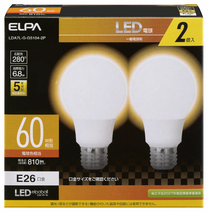 【返品種別A】□「返品種別」について詳しくはこちら□メーカー保証期間 5年◆白熱電球に近いサイズなので、様々な器具への取り換えが可能です◆ワイドに明るい広配光設計です。◆密閉型器具対応◆省エネ法2027年度目標基準達成■ 仕 様 ■全光束:810lm(一般電球60W形相当)光色:電球色相当配光角:280度口金:E26密閉形器具:対応調光器:非対応断熱材施工器具:非対応定格消費電力:6.8Wエネルギー消費効率:119.1lm/W定格寿命:40000時間寸法(約):外径60×全長107mm質量:43g[LDA7LGG51042P]ELPA生活家電>電球・管球>LED電球>一般電球形>口金サイズ:E26形>電球相当W数:50W〜70W