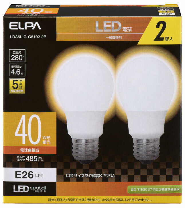 ELPA LED電球 一般電球形 485lm(電球色相当)【2個セット】 LDA5L-G-G5102-2P エルパ [LDA5LGG51022P]