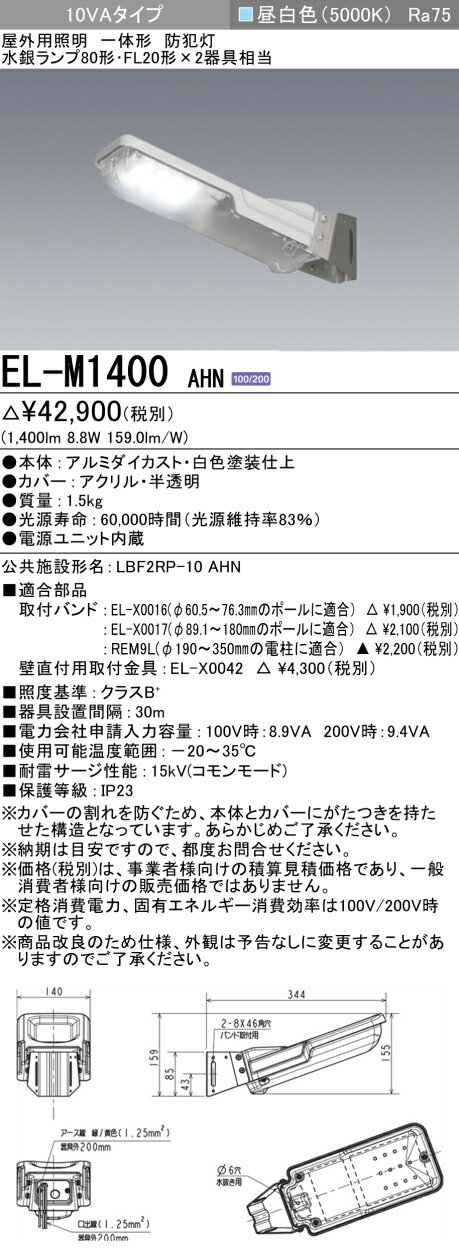 お取り寄せ 納期回答致します三菱電機 EL-M1400 AHN LED防犯灯 10VAタイプ(FL20W X 2 水銀ランプ80W相当) 昼白色 クラスB+ 30m『ELM1400AHN』