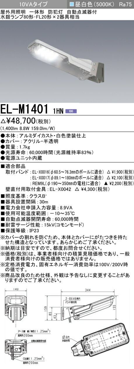 お取り寄せ 納期回答致します三菱電機 EL-M1401 1HN LED防犯灯 10VAタイプ(FL20W X 2 水銀ランプ80W相当) 昼白色 クラスB+ 30m 自動点滅器付 AC100V専用 『ELM14011HN』