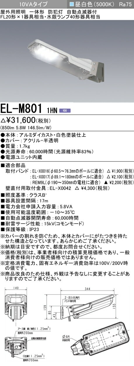 おすすめ品 お取り寄せ 納期回答致します三菱電機 EL-M800 1HN LED防犯灯 10VAタイプ(FL20W X 1 水銀ランプ40W相当) 昼白色 クラスB+ 17m『ELM8001HN』