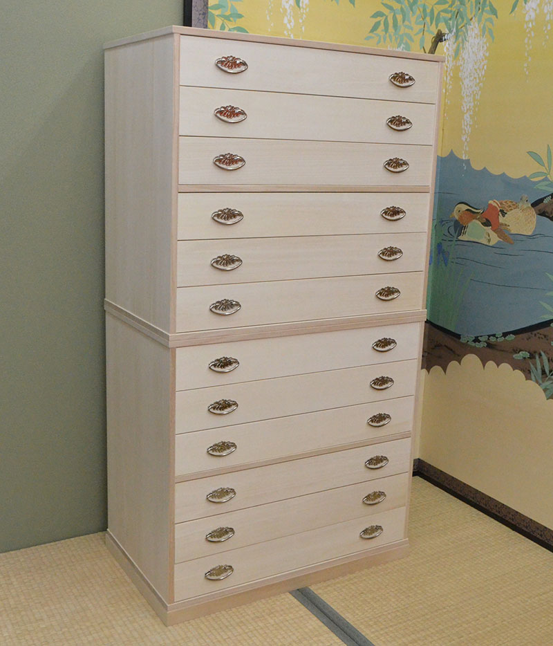 今回の生産分より高さが若干低くなり139cmになります。 追加でご購入される際は予め御了承の程宜しくお願い致します。関東〜九州送料無料 東北+4000円 北海道+6000円 沖縄・離島+8000円(玄関配送) 設置配送別途見積もり サイズ W75.4×D44.7×H138.2cm 引き出し内寸 W68.8×D38×H9cm 特徴 シルバー取っ手 市やまオリジナル重ねる12段帯タンス台輪つき幅75cm!! 肥前桐民芸国産品 天板・側板の厚みも15mmを使用しており 背板底板にも4MMの桐合板を使用!! 職人たちが素材にも仕様にもこだわっております。帯を入れるのに特化した帯タンスです。台輪有の6段もございます。当店のオリジナル商品で他店では販売しておりません!! 材質 本体・・・・・ 桐天然木無垢板15mm 引出し・・・ 桐天然木無垢板13mm 背板底板・・・4mm桐化粧合板 【完成品】 【国産品】 【関東〜九州送料無料】 【オリジナル】 【代引きOK】帯をしっかり入れることが出来る引出しです 価格以上にしっかりした造りの商品です!!