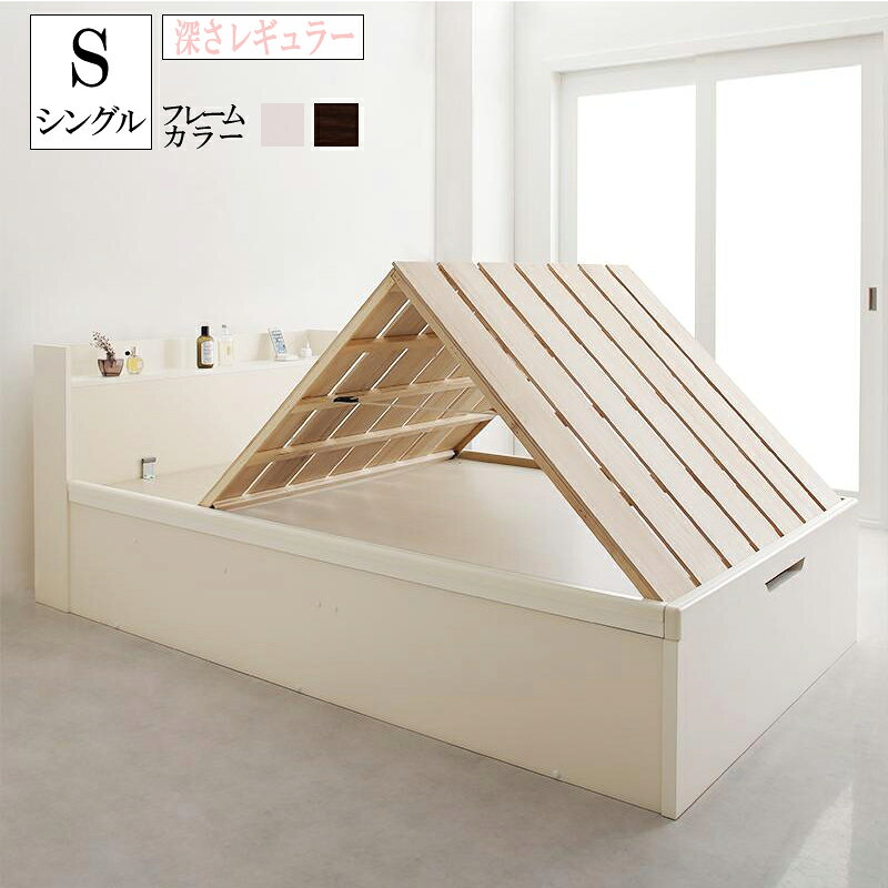 【送料無料】 すのこ 収納 ベッド シングル 深さレギュラー フレームのみ 国産頑丈スノコ跳ね上げ式大容量収納ベッド Long force ロングフォルス 木製 棚付き 宮付き コンセント付き 布団干し ダークブラウン ホワイト