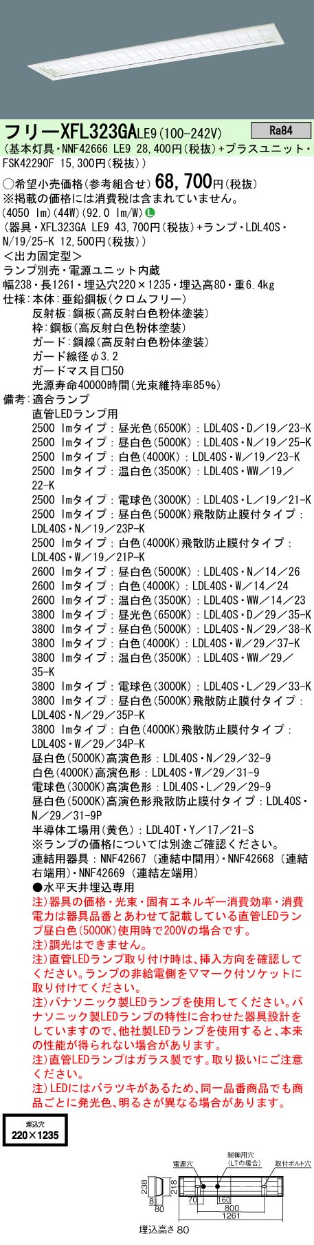 【仕様・注意事項】◆ランプ品名:LDL40S◆器具光束:4210lm◆安定器出力型:定格出力型◆安定器補足:[出力固定型]◆電圧:100〜242V◆消費電力:36W◆消費効率:116.9lm/W◆【本体】亜鉛鋼板(クロムフリー)◆【反射板】鋼板(高反射白色粉体塗装)◆【枠】鋼板(高反射白色粉体塗装)◆【ガード】鋼線(高反射白色粉体塗装)◆ガード線径φ3.2◆ガードマス目□50◆天井埋込型、ガード、別売ランプ2600lmタイプ省エネ形との組合せ◆Ra80◆●水平天井埋込専用◆連結用器具NNF42667(連結中間用)◆連結用器具NNF42668(連結右端用)◆連結用器具NNF42669(連結左端用)◆注)器具の価格・光束・固有エネルギー消費効率・消費電力は器具品番とあわせて記載している直管LEDランプ昼白色(5000K)使用時で200Vの場合です。◆注)調光はできません。◆注)直管LEDランプ取り付け時は、挿入方向を確認してください。ランプの非給電側を▽マーク付ソケットに取り付けてください。◆注)パナソニック製LEDランプを使用してください。パナソニック製LEDランプの特性に合わせた器具設計をしていますので、他社製LEDランプを使用すると、本来の性能が得られない場合があります。◆注)直管LEDランプはガラス製です。取り扱いにご注意ください。◆注)LEDにはバラツキがあるため、同一品番商品でも商品ごとに発光色、明るさが異なる場合があります。◆幅:238mm◆長:1261mm◆埋込穴幅:220mm◆埋込穴長:1235mm◆埋込高:80mm◆質量:6.4kg◆LDL40×2◆適合ランプ:直管LEDランプ用◆適合ランプ:2500lmタイプ:昼光色(6500K):LDL40S・D/19/23-K◆適合ランプ:2500lmタイプ:昼白色(5000K):LDL40S・N/19/25-K◆適合ランプ:2500lmタイプ:白色(4000K):LDL40S・W/19/23-K◆適合ランプ:2500lmタイプ:温白色(3500K):LDL40S・WW/19/22-K◆適合ランプ:2500lmタイプ:電球色(3000K):LDL40S・L/19/21-K◆適合ランプ:2500lmタイプ:昼白色(5000K)飛散防止膜付タイプ:LDL40S・N/19/23P-K◆適合ランプ:2500lmタイプ:白色(4000K)飛散防止膜付タイプ:LDL40S・W/19/21P-K◆適合ランプ:2600lmタイプ:昼白色(5000K):LDL40S・N/14/26◆適合ランプ:2600lmタイプ:白色(4000K):LDL40S・W/14/24◆適合ランプ:2600lmタイプ:温白色(3500K):LDL40S・WW/14/23◆適合ランプ:3800lmタイプ:昼光色(6500K):LDL40S・D/29/35-K◆適合ランプ:3800lmタイプ:昼白色(5000K):LDL40S・N/29/38-K◆適合ランプ:3800lmタイプ:白色(4000K):LDL40S・W/29/37-K◆適合ランプ:3800lmタイプ:温白色(3500K):LDL40S・WW/29/35-K◆適合ランプ:3800lmタイプ:電球色(3000K):LDL40S・L/29/33-K◆適合ランプ:3800lmタイプ:昼白色(5000K)飛散防止膜付タイプ:LDL40S・N/29/35P-K◆適合ランプ:3800lmタイプ:白色(4000K)飛散防止膜付タイプ:LDL40S・W/29/34P-K◆適合ランプ:昼白色(5000K)高演色形:LDL40S・N/29/31-9◆適合ランプ:白色(4000K)高演色形:LDL40S・W/29/29-9◆適合ランプ:電球色(3000K)高演色形:LDL40S・L/29/25-9◆適合ランプ:昼白色(5000K)高演色形飛散防止膜付タイプ:LDL40S・N/29/29-9P◆適合ランプ:半導体工場用(黄色):LDL40T・Y/17/21-S◆適合ランプ:※ランプの価格については別途ご確認ください。◆色温度:5000K◆光源寿命40000時間(光束維持率85%)【基本灯具】NNF42666LE9【プラスユニット】FSK42290F【推奨ランプ】LDL40S・N/14/26※別売※取付工事は必ず、工事店、電気店(有資格者)に依頼してください。一般の方の工事は禁止されています。